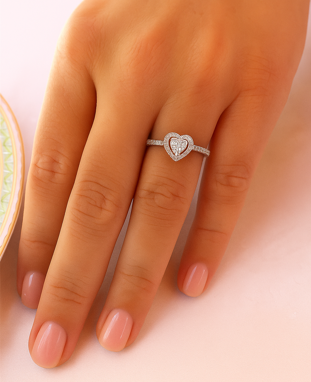 Romance refined into its most graceful form. This exquisite ring features a captivating heart shaped centre gem, framed by a shimmering halo of brilliant pavé-set gems. A timeless symbol of love, perfect for engagements, anniversaries, or meaningful gifts of devotion.