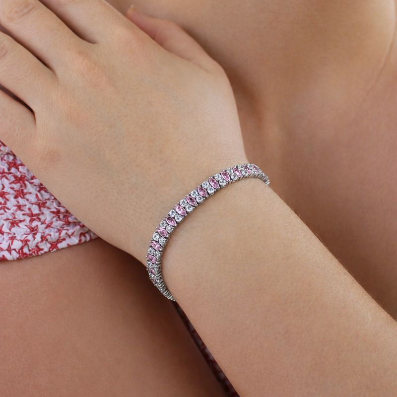 This 7-inch celebrity style bracelet is brought to life with shimmering alternating uniquely cut pink and flawless white simulated diamonds, drawing the eye with the flash of colour.