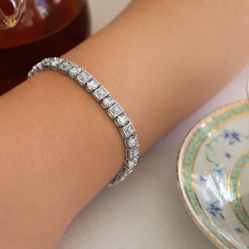 Set with baguette and oval cut Tru-Diamonds™ totalling 12.96 carats in the iconic Art Deco style of Britain’s Roaring Twenties, the Empyreal Bracelet is the quintessence of glamour. This striking piece, measuring 7 inches in length, is an ideal accessory for a special occasion or as a milestone gift.