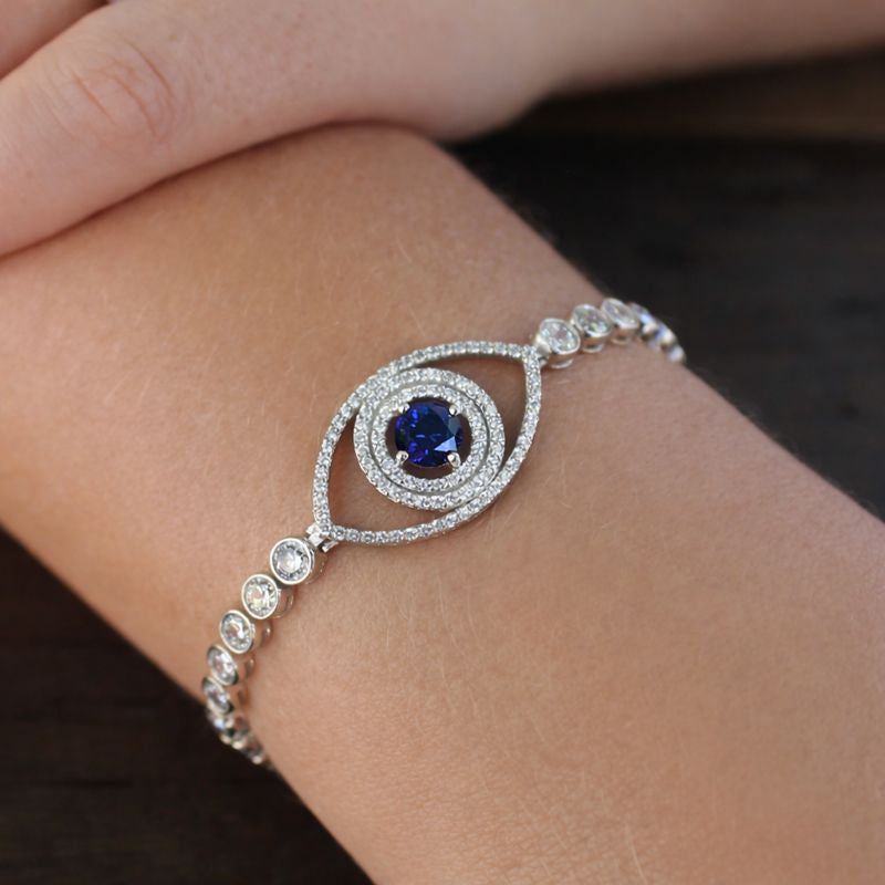 This eye-catching tennis bracelet features a Tru Sapphire centre gem surrounded by two radiant halos of Tru-Diamonds™. A luxurious piece that brings drama and brilliance to the wrist.