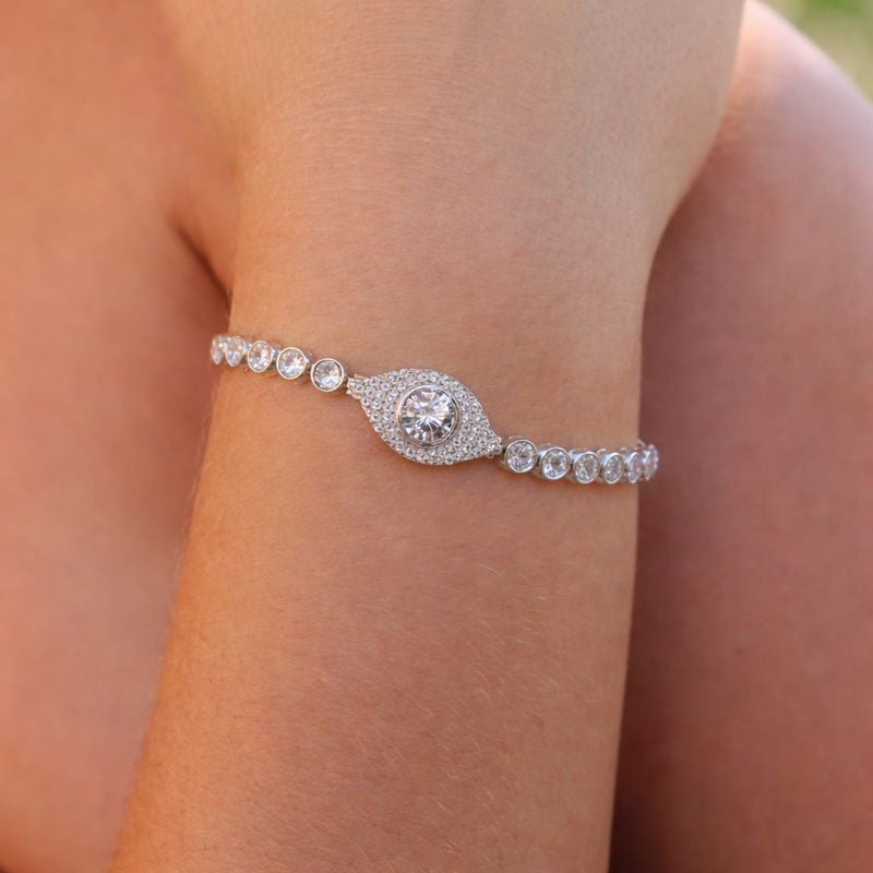 A celebration of refined sophistication, this tennis bracelet features a showcases brilliant Tru-Diamonds™ encircled by a radiant pave setting. Perfectly balanced for everyday elegance or evening glamour.