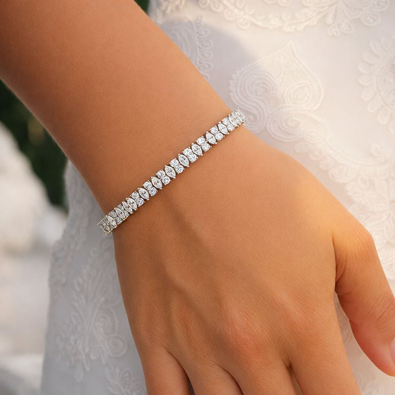 A luxurious statement piece that exudes elegance and timeless beauty, this 7-inch tennis bracelet showcases a stunning array of marquise cut Tru-Diamonds, meticulously set to captivate and dazzle with every movement. Boasting a total weight of 13.5 carats, the bracelet sparkles with an unparalleled brilliance. The Sparkling Delight Bracelet adds a touch of glamour to any ensemble, making it an essential addition to your jewellery collection.