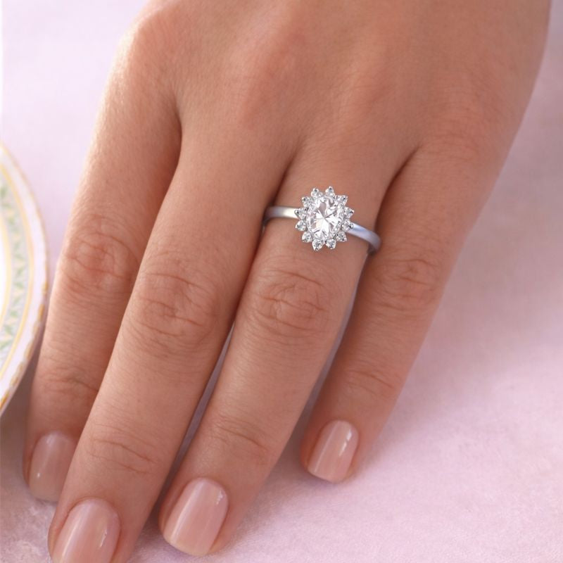A captivating design and a truly timeless jewellery piece, our Pure Cluster Ring features a 1.25 oval cut Tru-Diamonds™ centre gem elegantly framed by a cluster of glistening round brilliant cut Tru-Diamonds™ to maximise its sparkle.