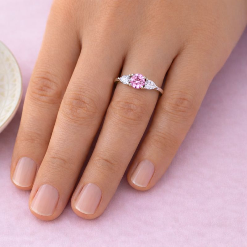 Tru-Diamonds™ Round and Pear Cut Pink Synthetic Lab Grown Diamond Trilogy Ring