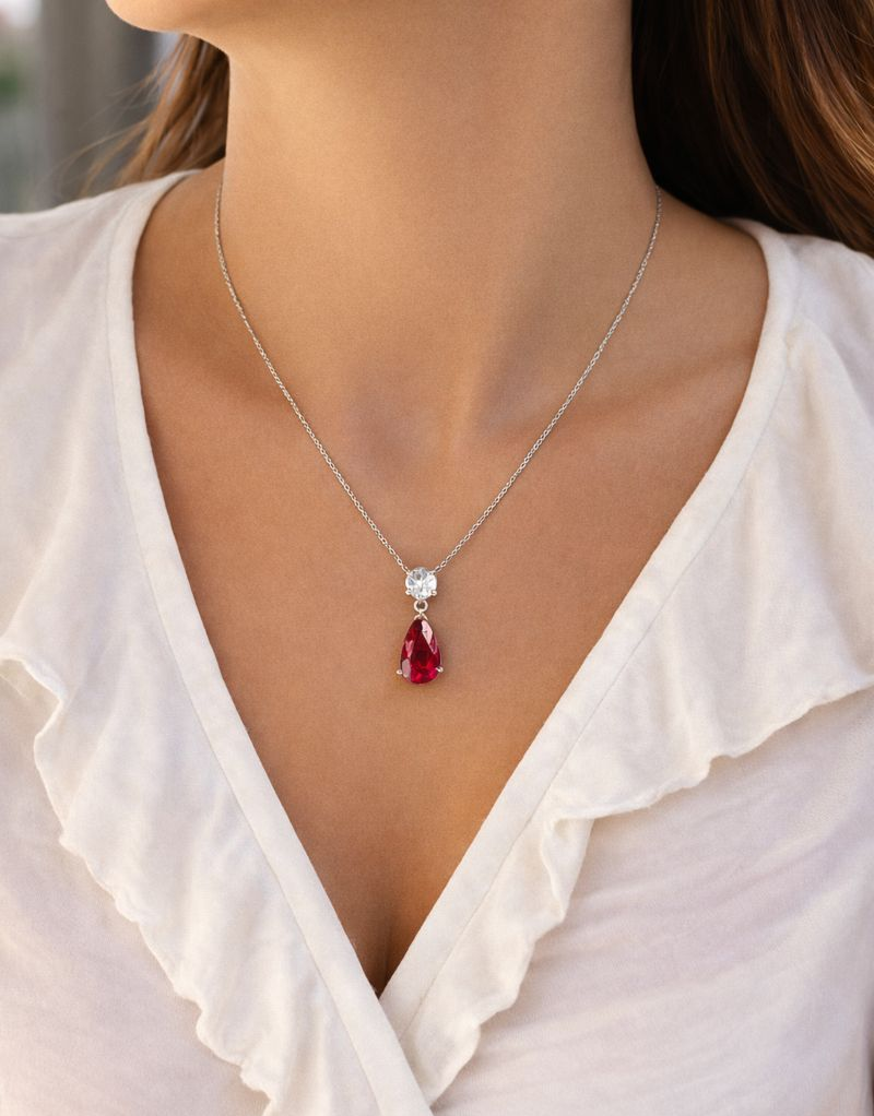 The Tru Ruby Chéri Amour Pendant combines the smooth simplicity of a solitaire Tru-Diamonds™ gem with the captivating intricacy of a teardrop Tru Ruby.