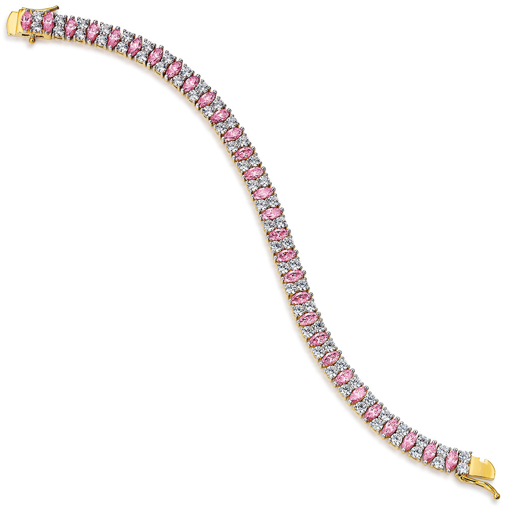 This 7-inch celebrity style bracelet is brought to life with shimmering alternating uniquely cut pink and flawless white simulated diamonds, drawing the eye with the flash of colour.