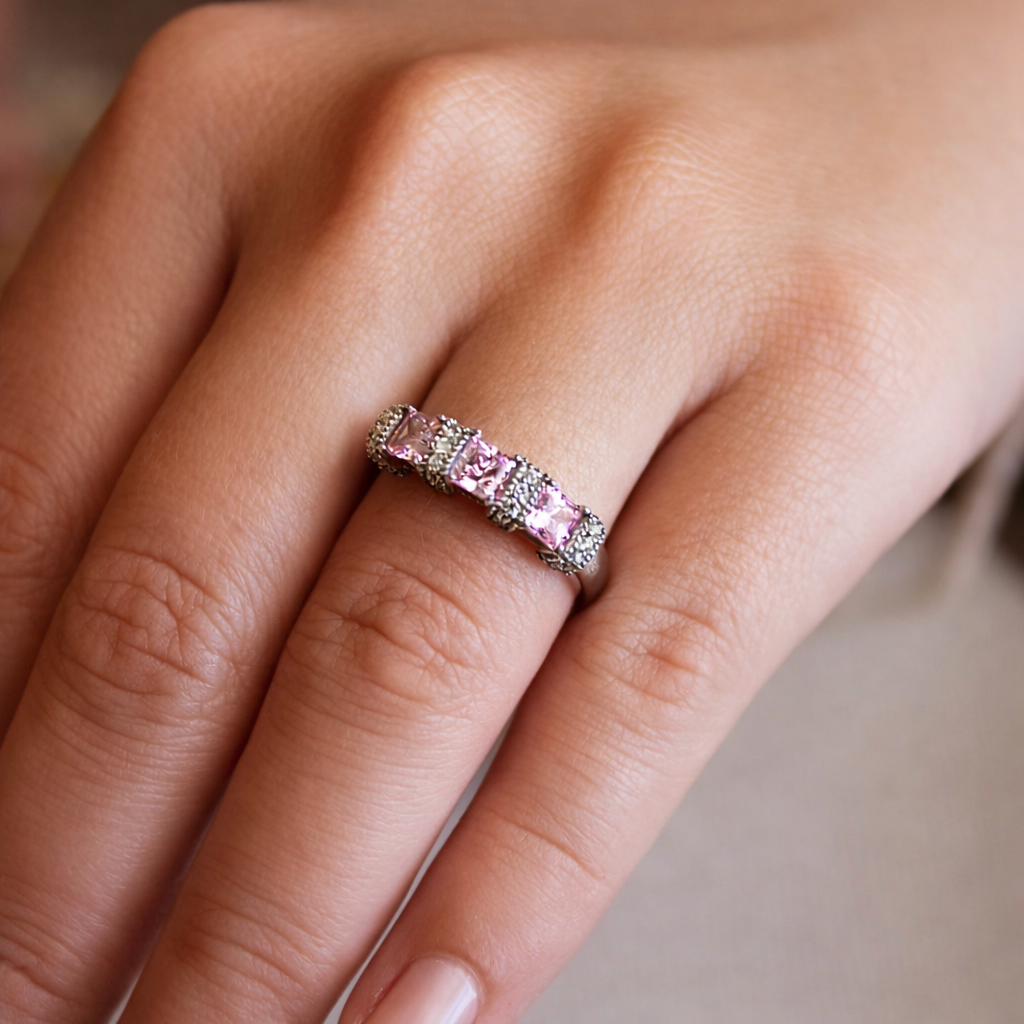 A uniquely beautiful ring guaranteed to have compliments streaming your way. A trilogy of perfectly matched princess cut pink Tru-Diamonds™ create the focal point of the Pink Parfait Ring while interlacing Tru-Diamond sparkle.