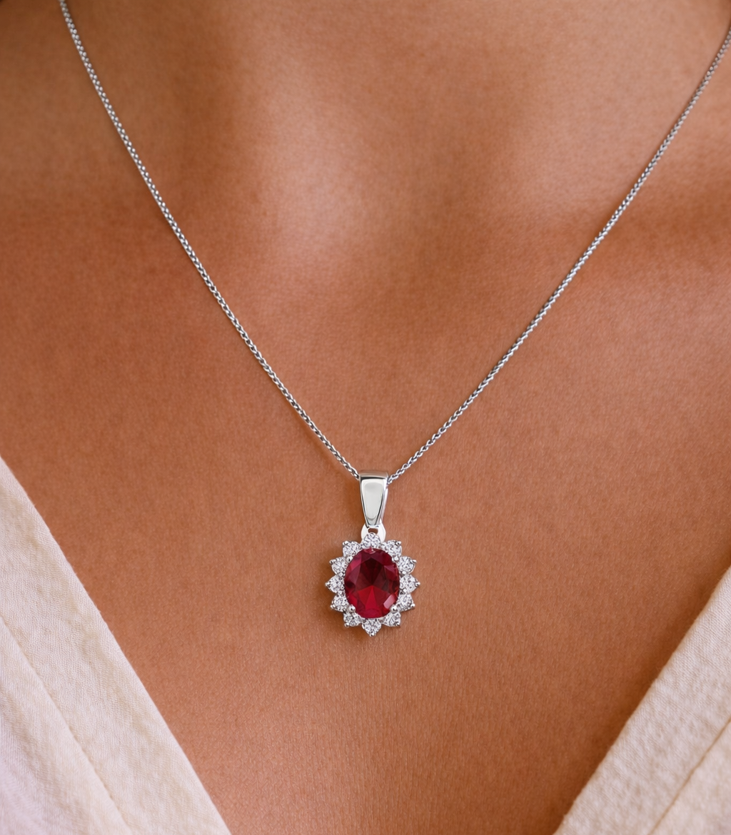 The Royal Tru Ruby Pendant epitomizes graceful extravagance. The magnificent oval Tru Ruby is surrounded by 12 shimmering, pure ice white Tru-Diamonds™ gems.