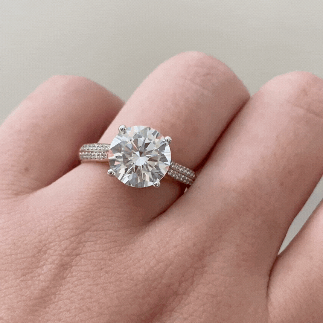The elegantly spectacular Grand Accolade ring, featuring a 4 ct. ice white flawless Tru-Diamonds™ centre gem, will turn heads and draw compliments whenever you wear it. This impressive piece is ideal for wearing to special events or as an opulent everyday accessory.