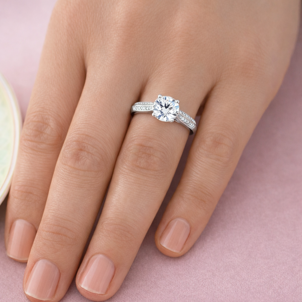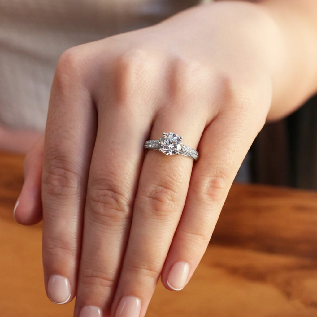 Adorn your finger with the captivating allure of the Accolade ring, showcasing a stunning 2 ct. ice white Tru Diamond, radiating brilliance and elegance. Be prepared to captivate attention and receive compliments wherever you go with this remarkable piece adorning your hand. Perfect for elevating your everyday ensemble with timeless sophistication.