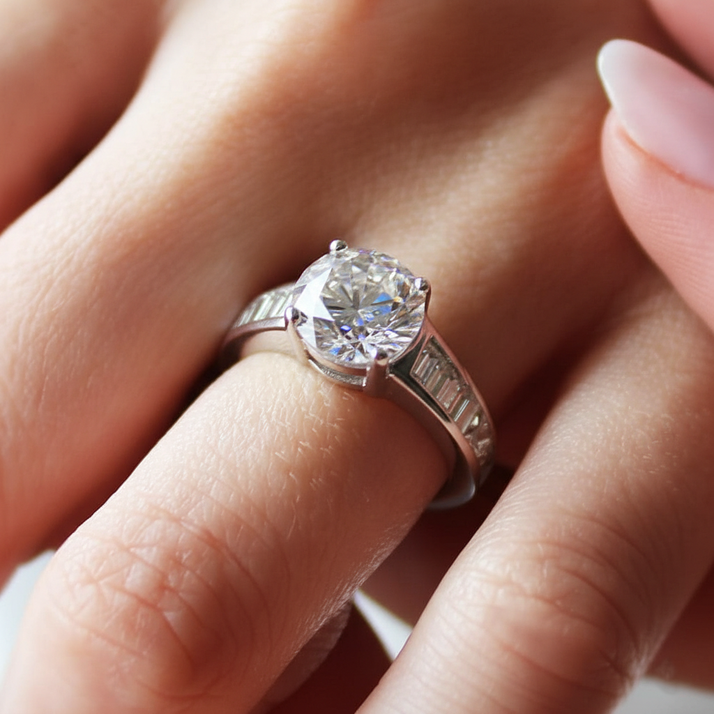 If you want to feel like royalty, the Queen Victoria Ring is the perfect choice. A brilliant round cut centre gem takes the spotlight, shimmering with captivating fire and sparkle. The shoulders are adorned with striking baguettes, channel-set for a sleek, modern look. This ring combines classic elegance with contemporary sophistication.
