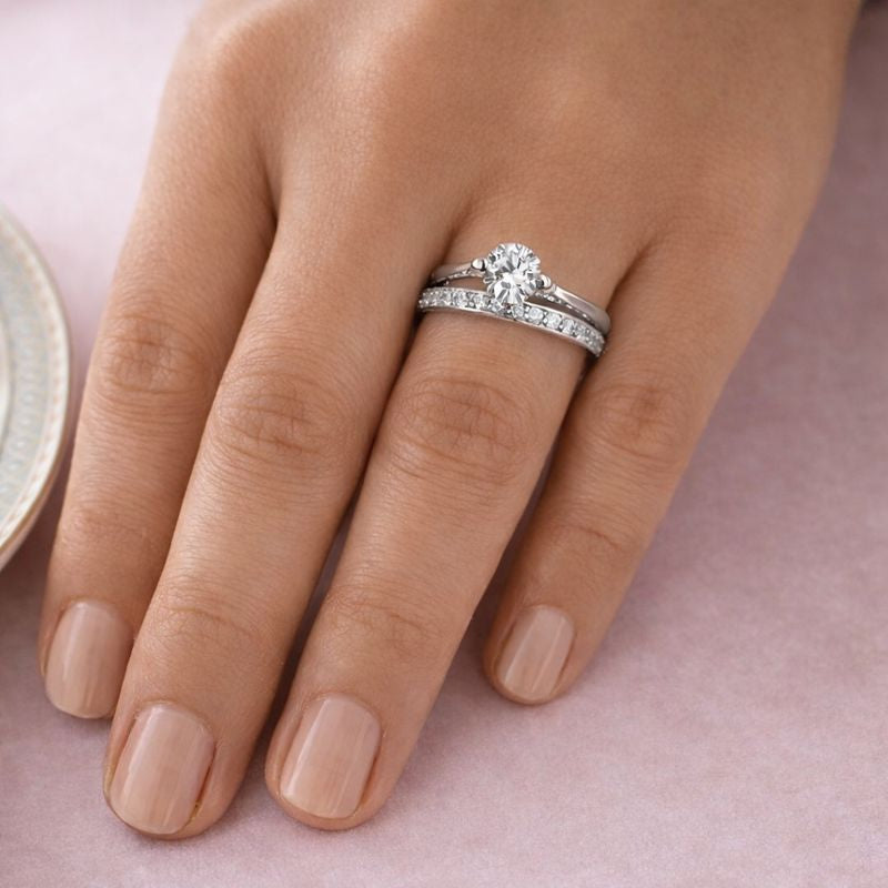 Our 1.5 ct. t.w. Solitaire Eternity Ring Set displays an elegantly simple solitaire ring, perfectly complemented alongside a fitted eternity style band. This set is suitable for any occasion or outfit.