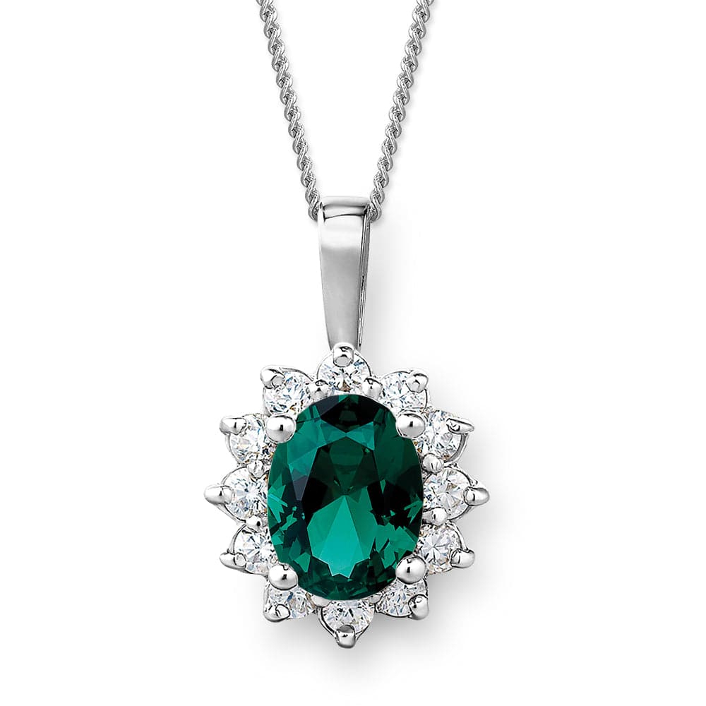 The Royal Tru Emerald Pendant epitomizes graceful extravagance. The magnificent oval Tru Emerald is surrounded by 12 shimmering, ice white Tru-Diamonds™ gems.