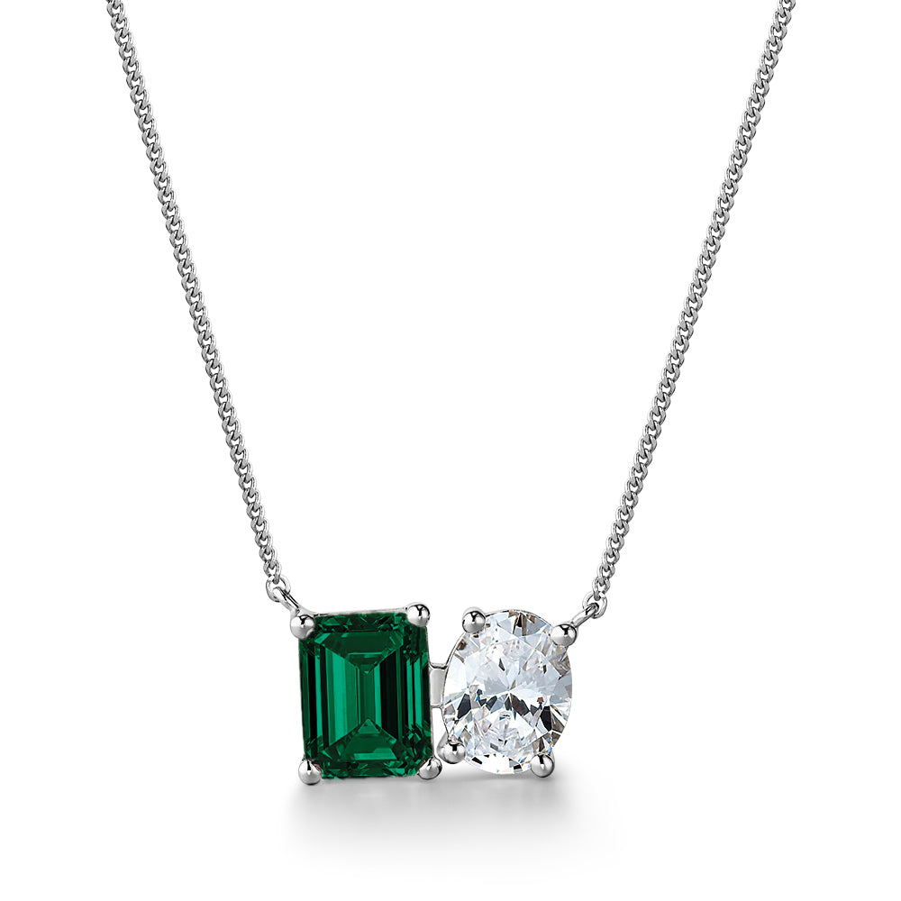 Radiating elegance and charm, the Toi et Moi Tru Emerald and Oval Necklace pairs a vibrant princess-cut Tru Emerald with a graceful oval gemstone. This symbolic necklace represents the union of two distinct yet harmonious elements, making it an ideal gift or a special addition to your jewellery collection.