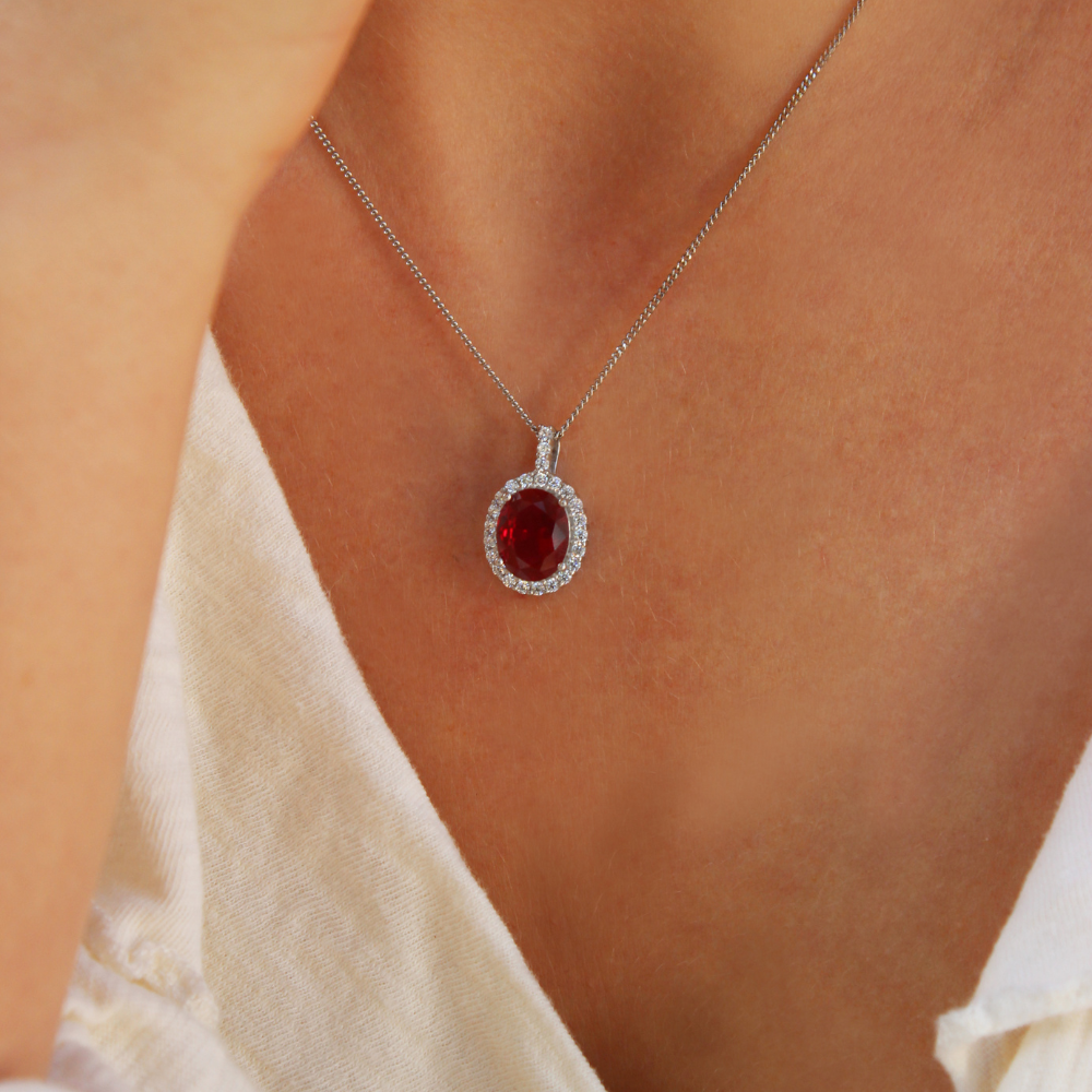 Dazzling, memorable and elegant, our timeless Tru Ruby Cincature Pendant showcases an elegant halo of Tru-Diamonds™ gems framing a 2.5 ct. oval cut Tru Ruby centre gem. Our Tru Ruby Cincature Pendant reflects superior craftsmanship and elegance you’re guaranteed to love.