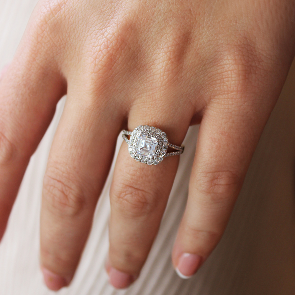 Tru-Diamonds™ Asscher Cut Synthetic Lab Grown Diamond Double Halo Ring