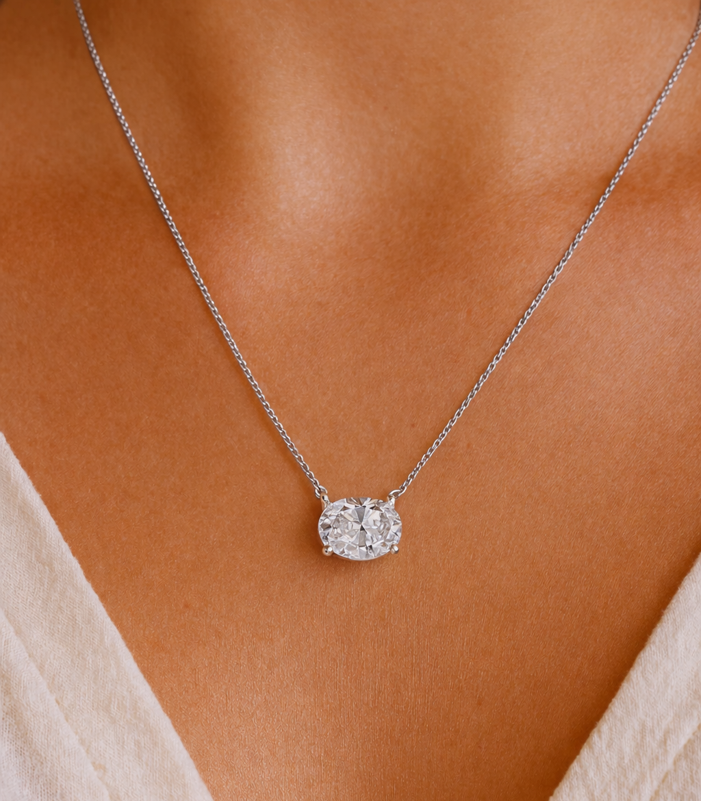 A sleek, contemporary twist on a jewellery staple, the 2 ct. East-West Oval Cut Necklace exudes effortless glamour. Showcasing a brilliant 2-carat oval cut Tru-Diamonds™ gem in a striking horizontal setting, this necklace is designed to catch the light from every angle. Suspended from a delicate yet durable chain, it’s a versatile piece that transitions seamlessly from day to night. Elegant, refined, and undeniably eye-catching—this is everyday luxury at its finest.