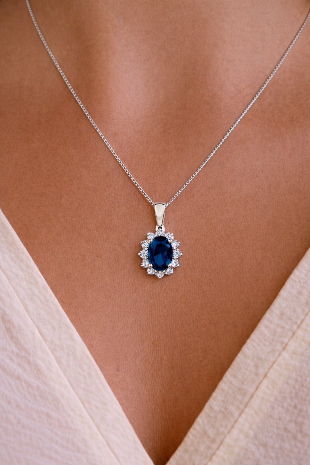 The Royal Tru Sapphire Pendant epitomizes graceful extravagance. The magnificent oval Tru Sapphire is surrounded by 12 shimmering, ice white Tru-Diamonds™ gems.