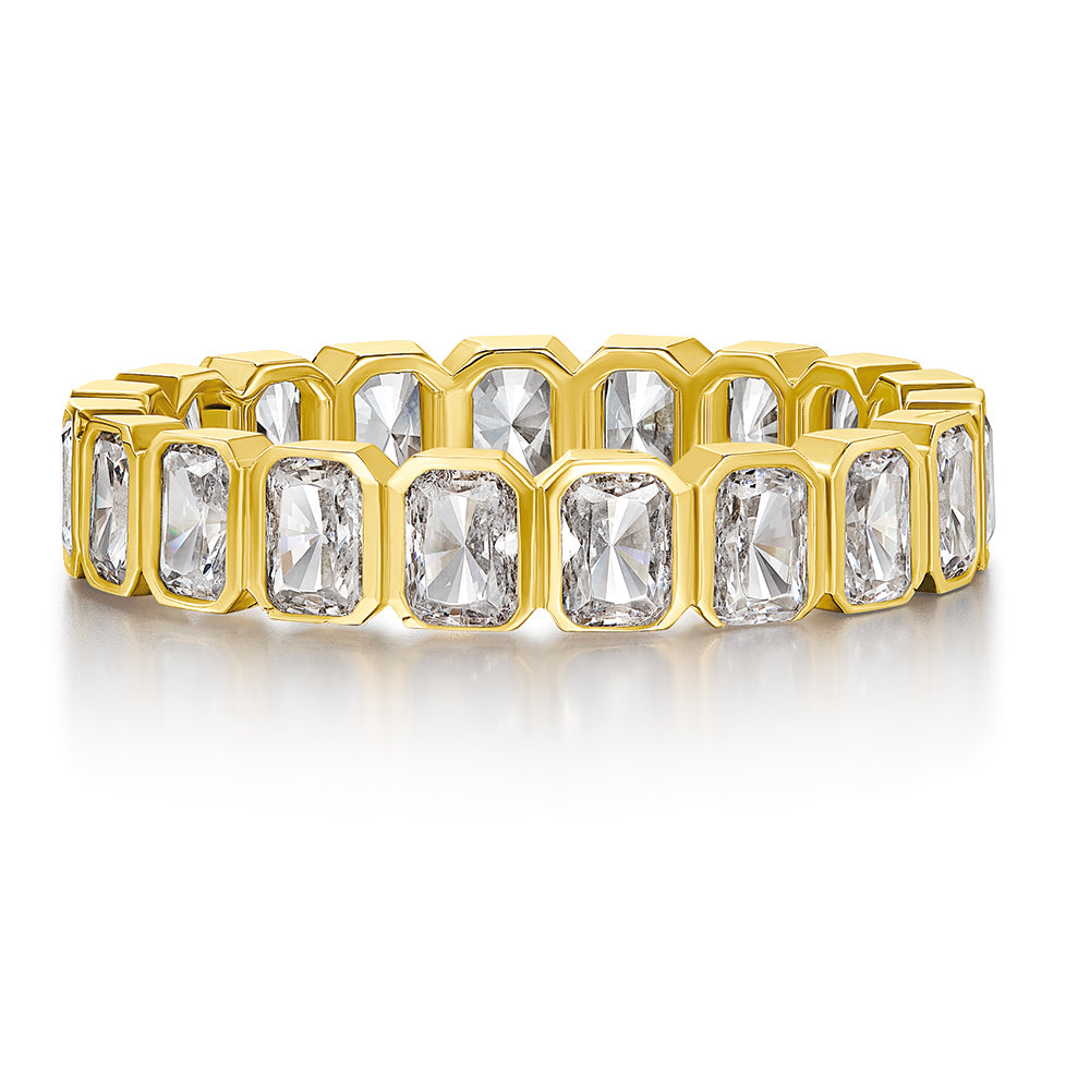 Bold brilliance meets timeless design in The Meridian Band. Featuring a full circle of emerald-cut Tru-Diamonds™, this striking eternity ring exudes modern glamour and structured elegance. Each gem is expertly cut to maximise light play, creating a radiant, architectural effect that's perfect worn solo or stacked with your favourites. A standout piece for the woman who commands attention - effortlessly.