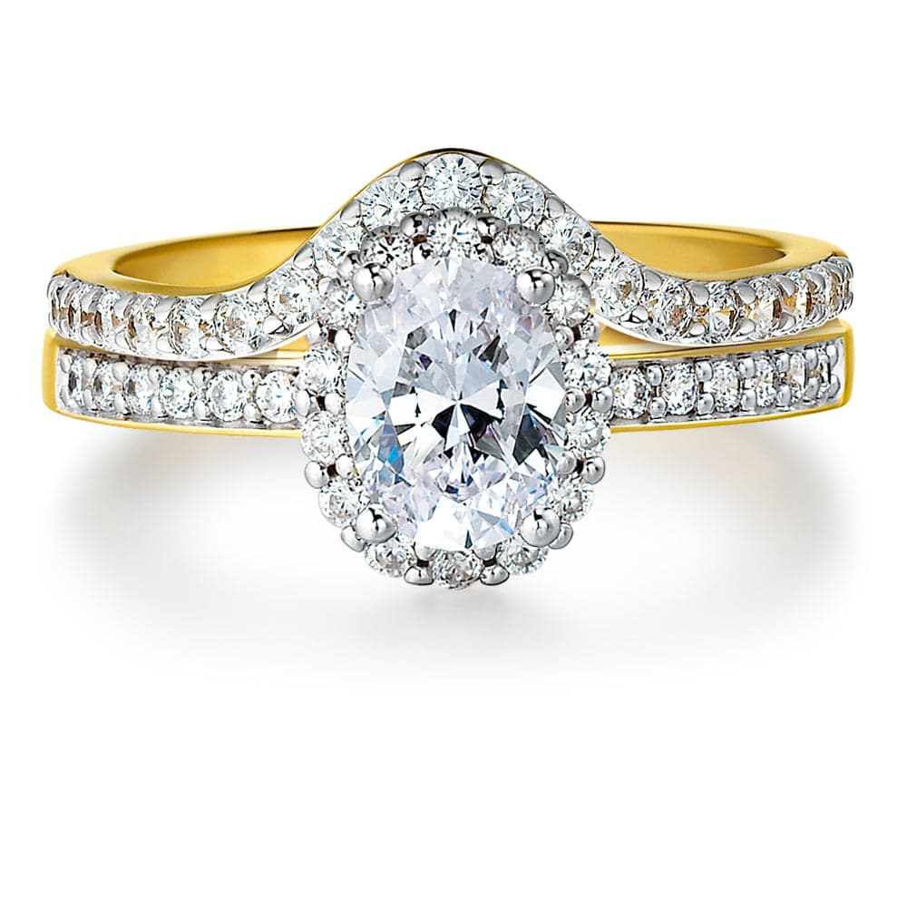 A simplistic set of elegance that is composed of our timeless Cincature Ring and Dome Eternity Ring. The 1.5 ct. oval cut Tru-Diamonds™ centre stone with a slender, eternity style band is completed with the soft wishbone shape that has 19 glistening Tru-Diamonds™ gems that have been perfectly cut and set in a channel.