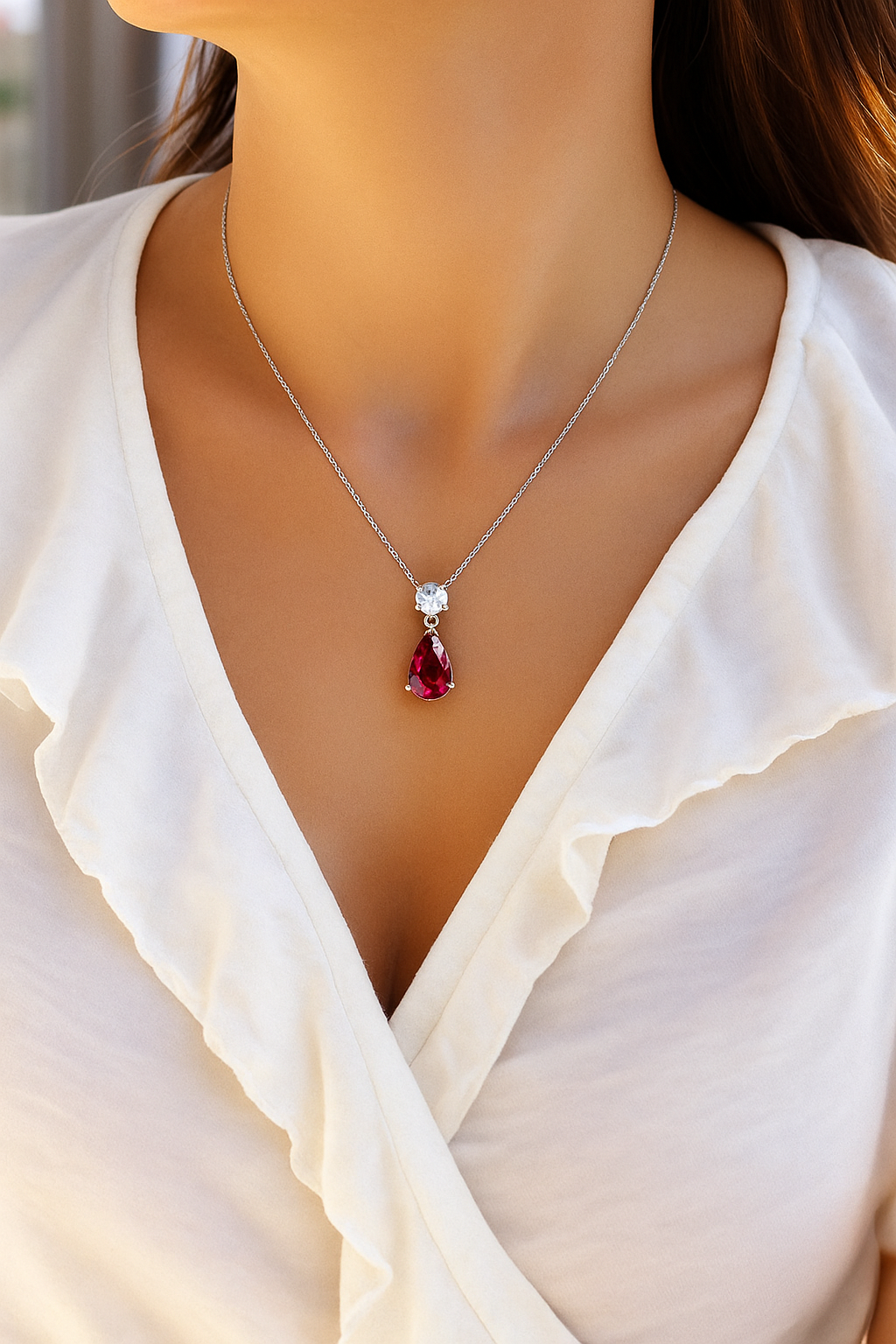 The Tru Ruby Chéri Amour Pendant combines the smooth simplicity of a solitaire Tru-Diamonds™ gem with the captivating intricacy of a teardrop Tru Ruby.