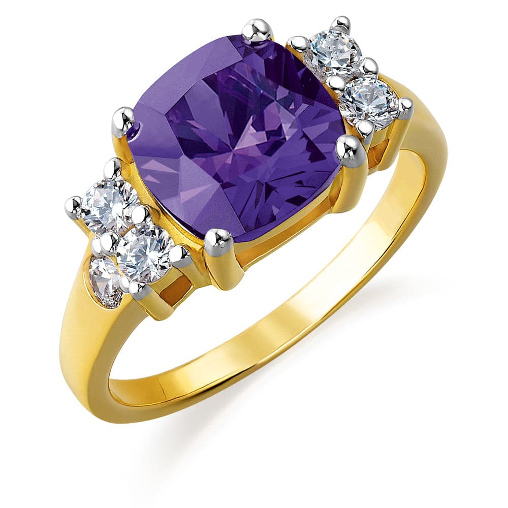 Create a sensation every time you wear this Tru Amethyst Perfection Ring with its breathtaking 5.62 carat cushion-cut Tru-Diamonds™ centre gem and three 0.10 carat round brilliant Tru-Diamonds™ on either side.
