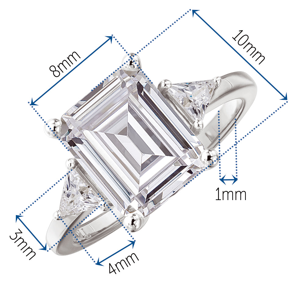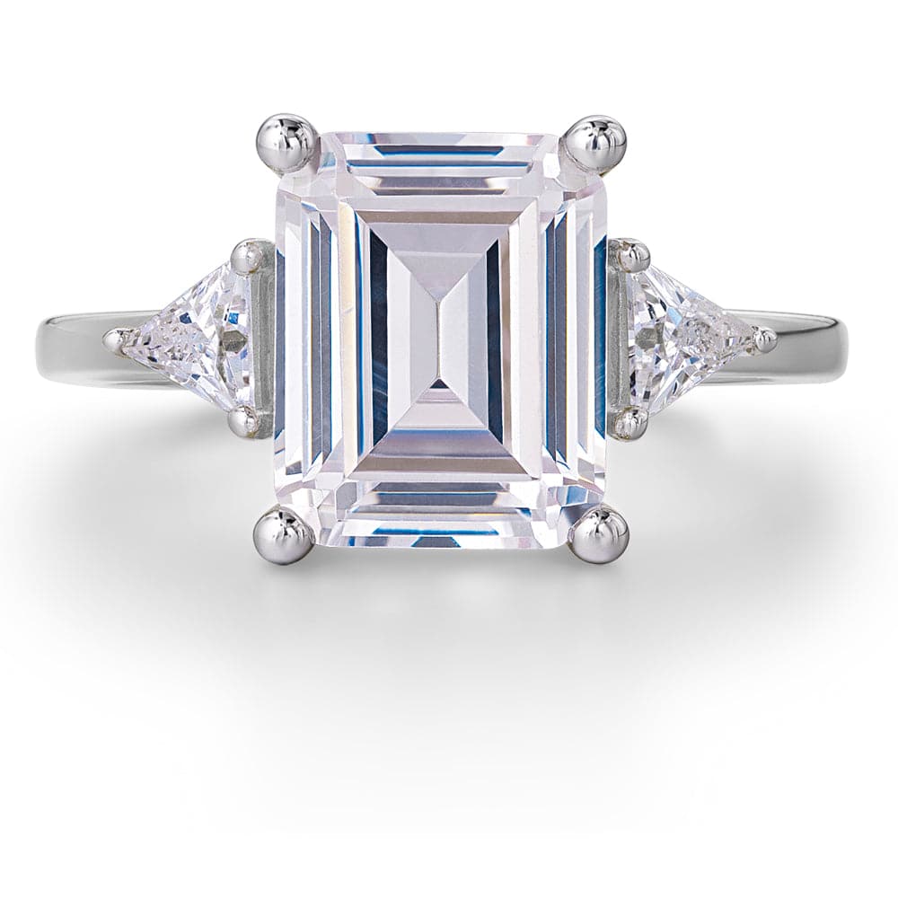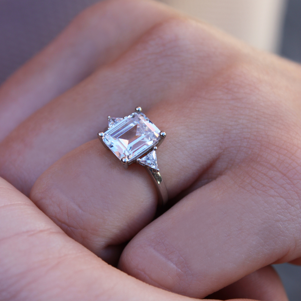 Prepare to be captivated with the Prism of Light Ring. This ring features a perfectly cut 3.80 ct. Emerald Cut Tru-Diamond as the centre gem, flanked by two Trillion Cut gems. This is a truly classic and elegant design that will ensure that you get compliments.
