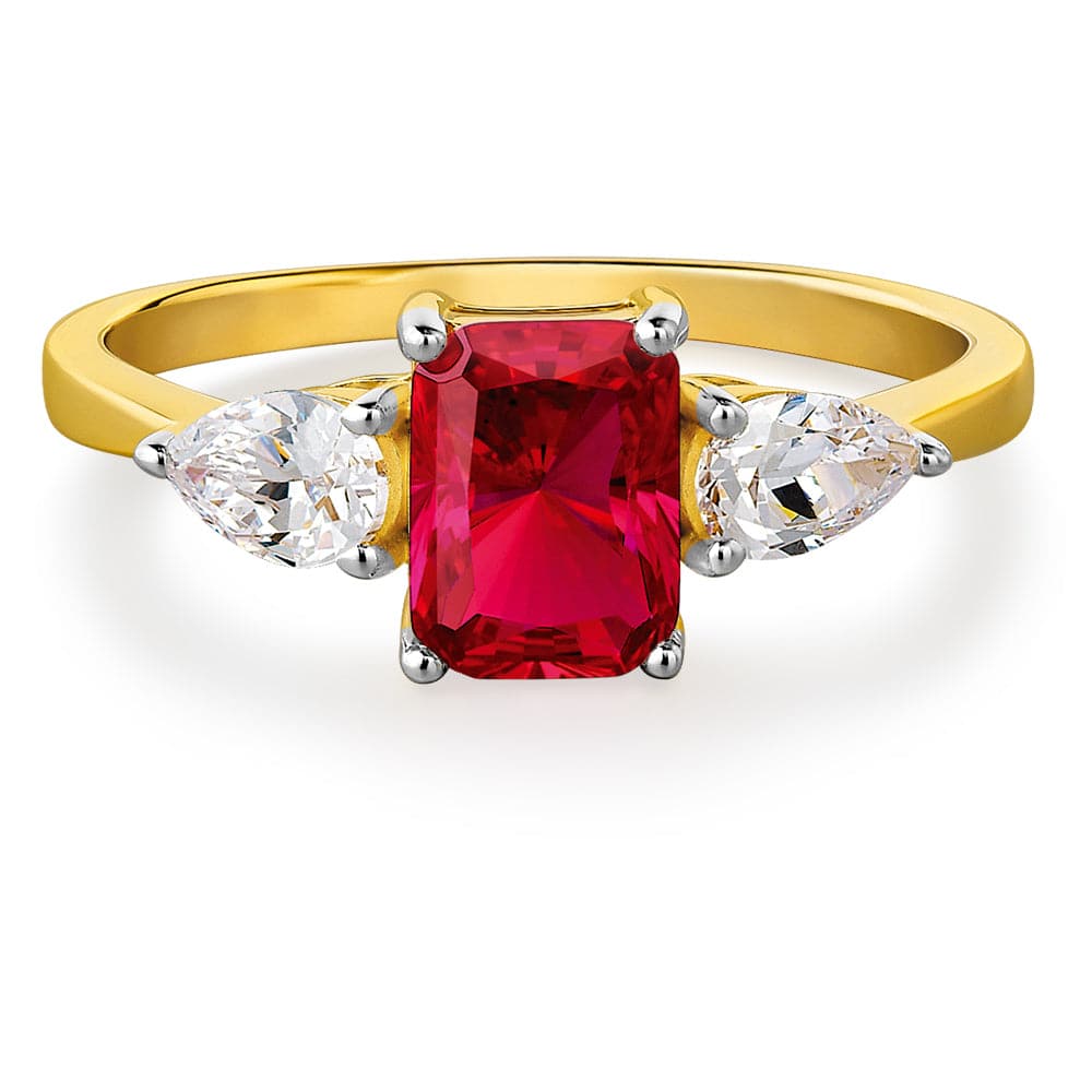 Tru Ruby Radiant and Pear Cut Synthetic Lab Grown Diamond Trilogy Ring