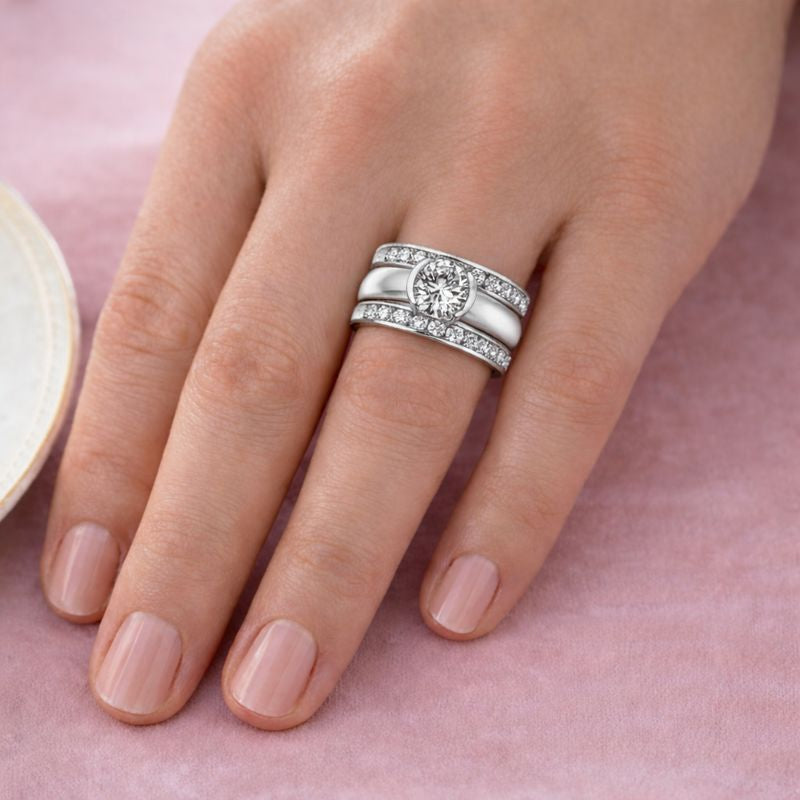 An absolute classic with a unique twist, our 2 ct. Budding Solitaire Ring centered between two Bold and Beautiful Eternity Rings are an ageless combination. Each eternity ring features a channel of 11 sparkling Tru-Diamonds™, complemented with a classic solitaire that will exudes elegance for eternity.