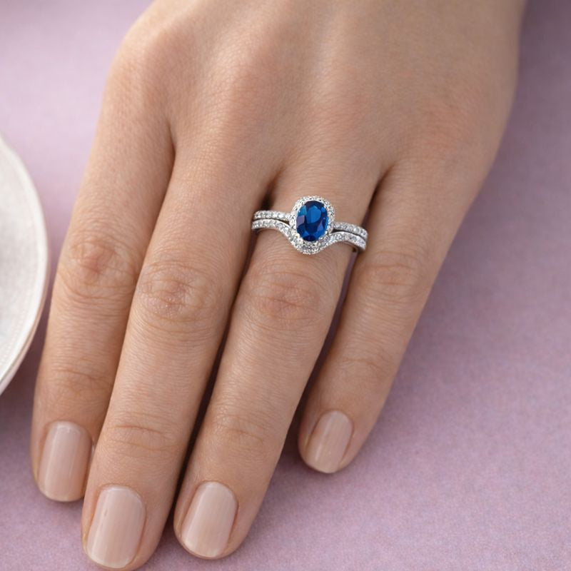 Tru Sapphire Oval Cut Synthetic Lab Grown Diamond Halo Ring Set