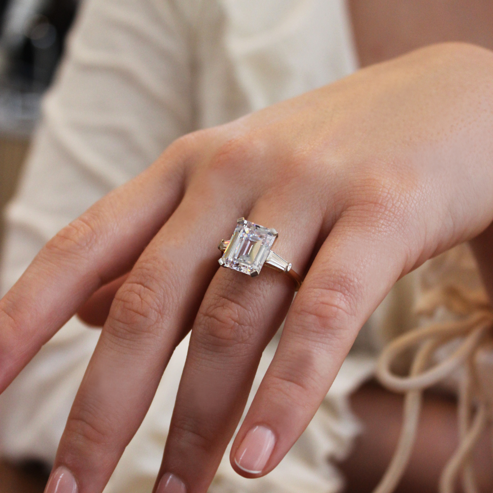 Tru-Diamonds™ Emerald and Tapered Baguette Cut Synthetic Lab Grown Diamond Grace Kelly Replica Engagement Ring