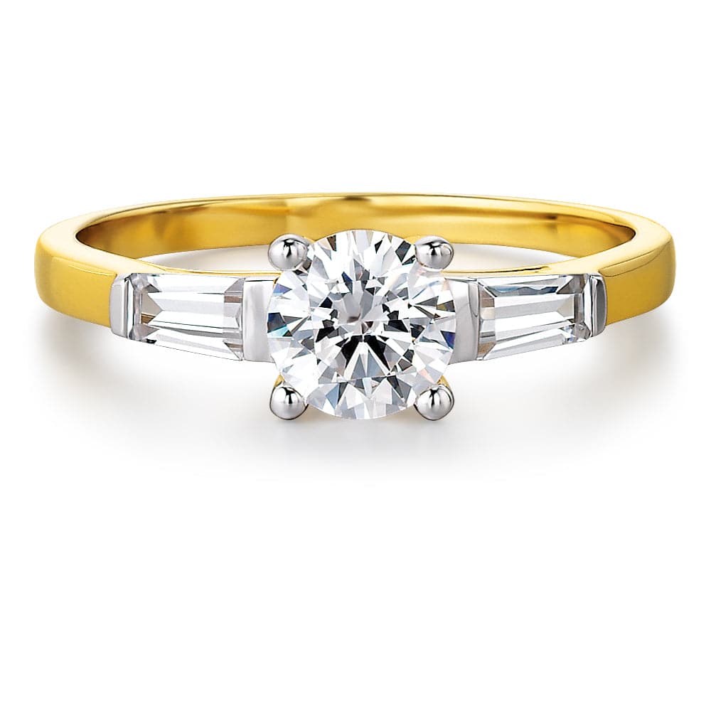 Dazzling and tasteful, our Gala Event Ring with its 1 ct. round brilliant, claw set Tru-Diamonds™ centre gem flanked by channel set baguettes and will be the centre of attraction wherever you go.