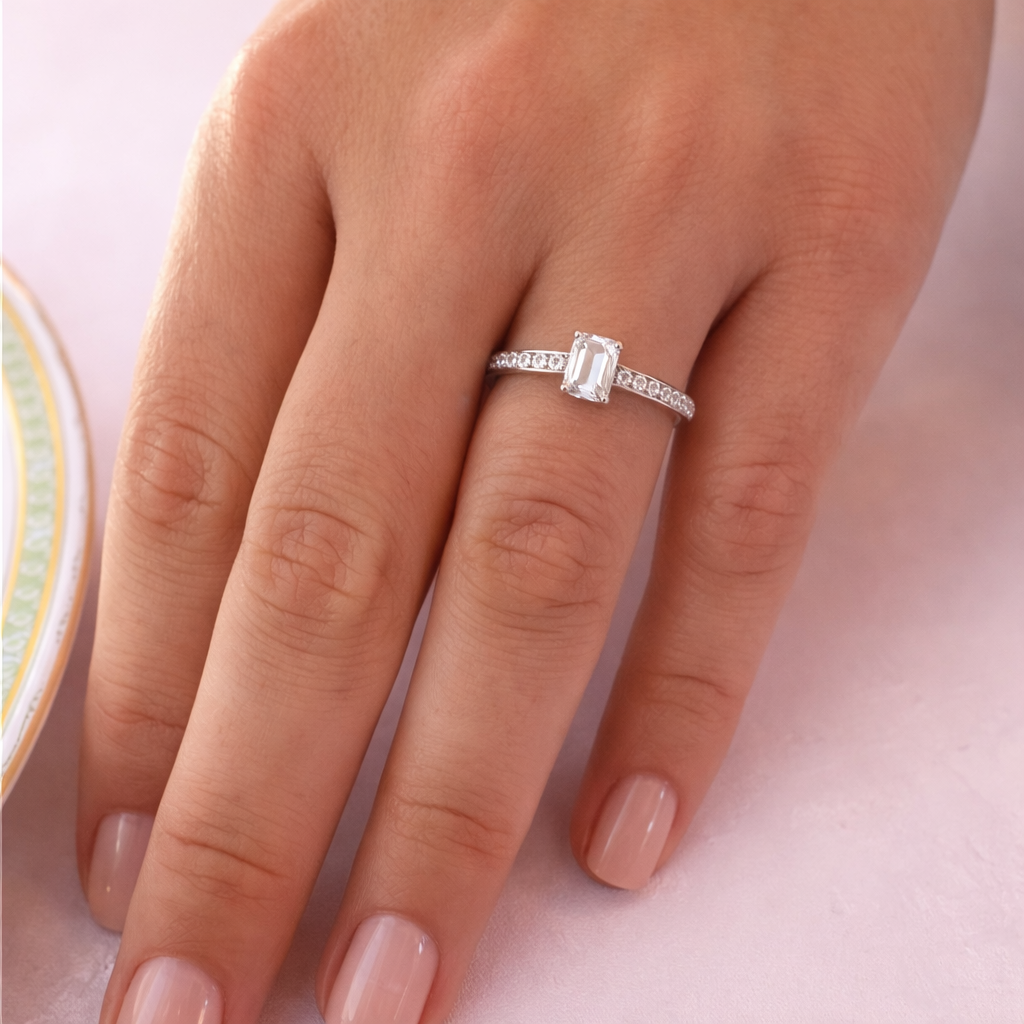 Tru-Diamonds™ Emerald Cut Synthetic Lab Grown Diamond Shoulder Set Ring