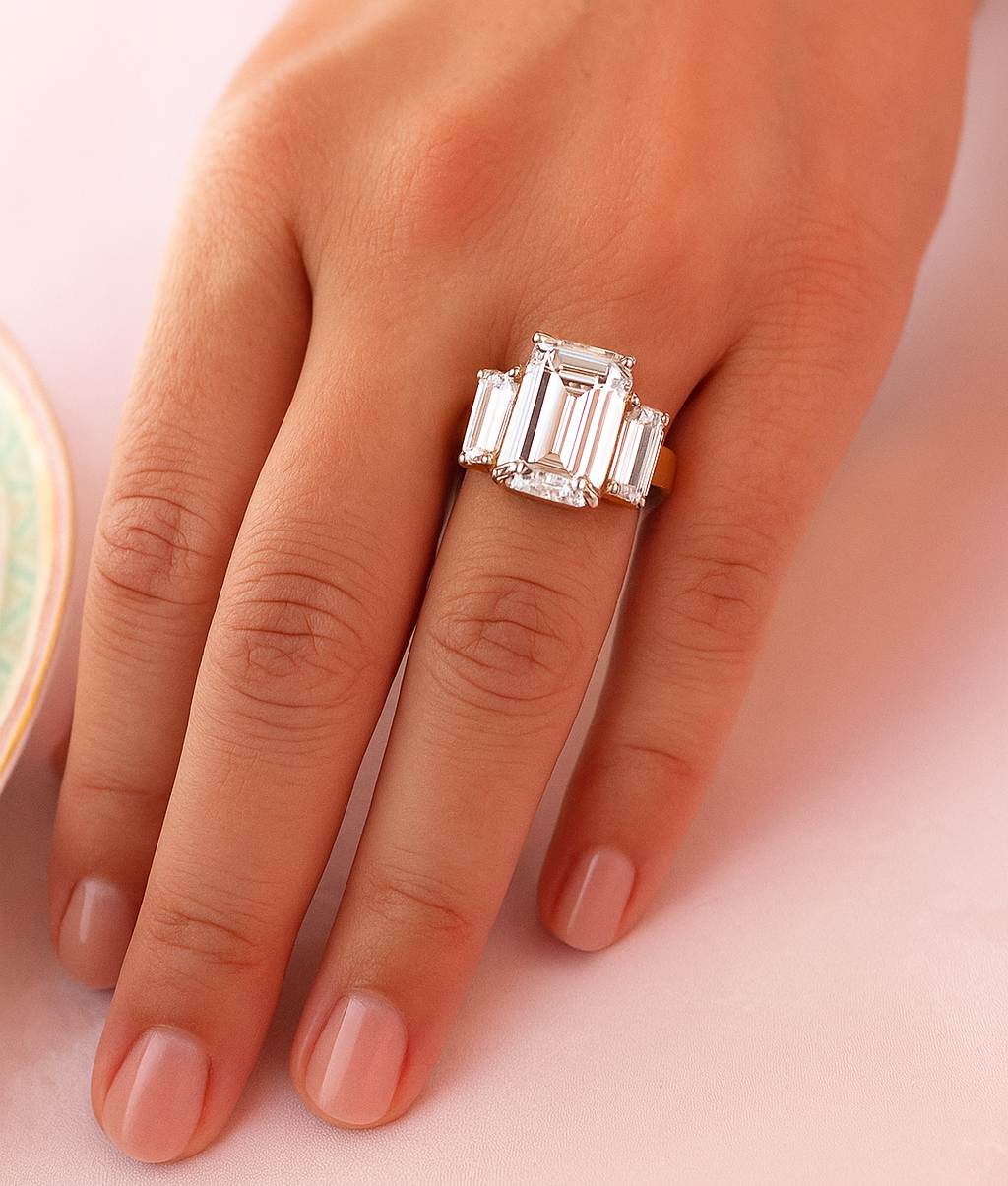 7.35 Carat Impressive Emerald Cut Trilogy Ring