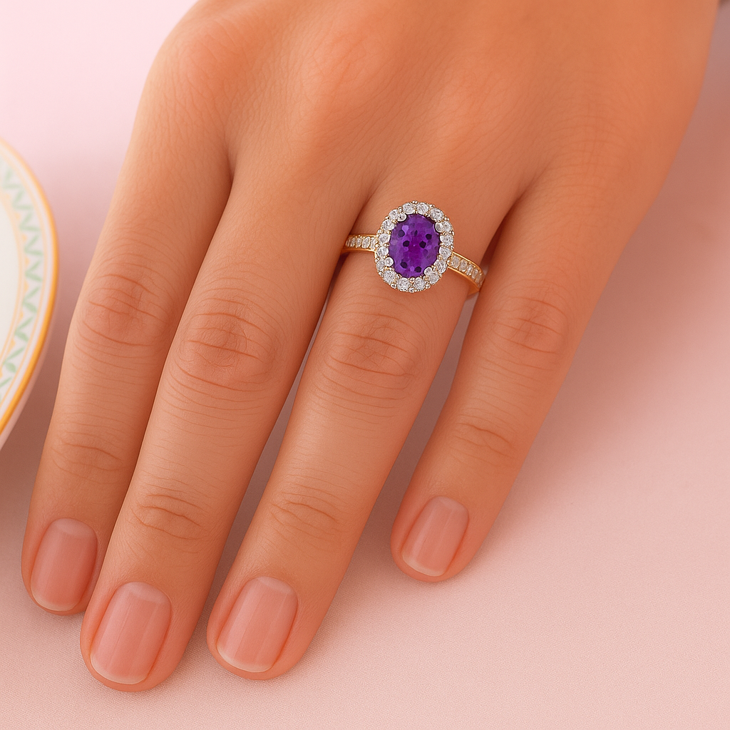 Our timeless Cincature Ring showcases an elegant halo of Tru-Diamonds™ framing a larger 1.75 ct. oval cut Amethyst Tru-Diamonds™ centre gem with a slender, eternity style band completing the design without competing for attention.