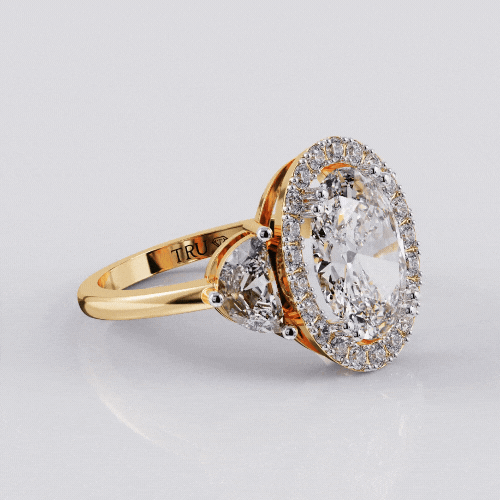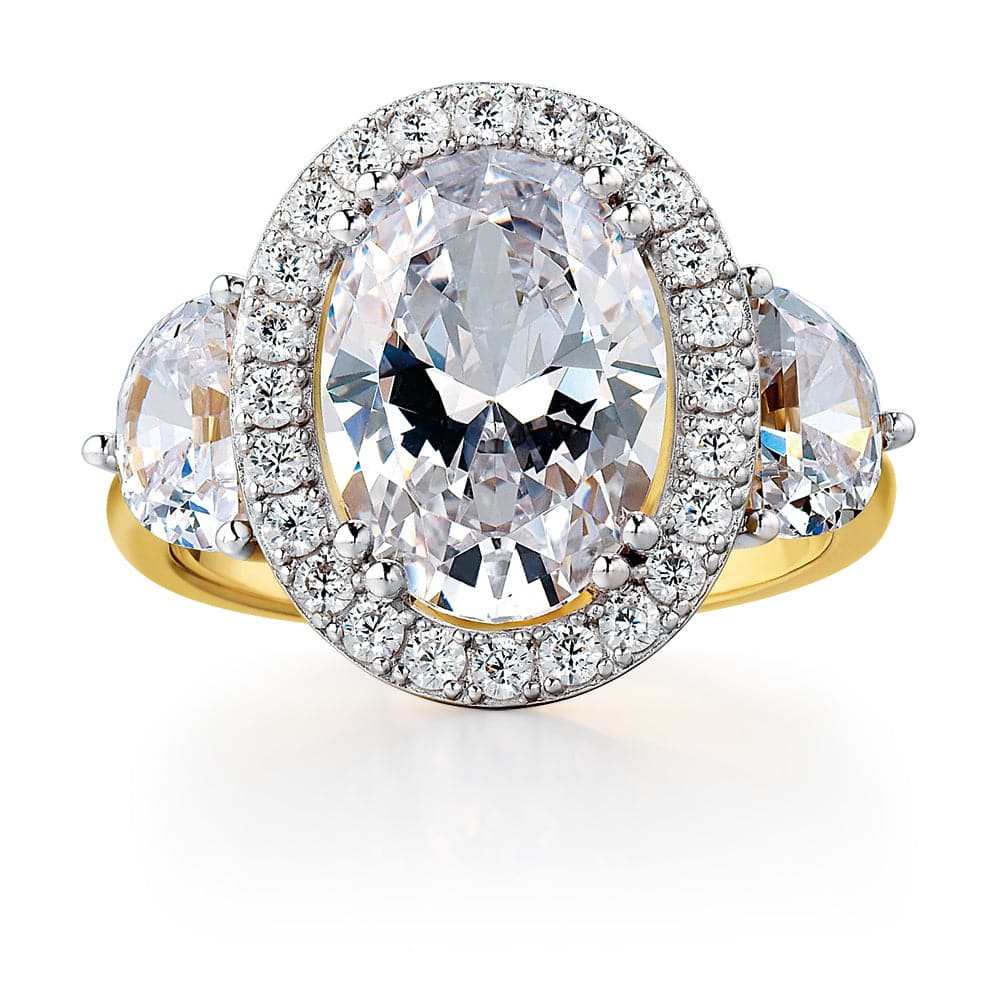 Our iconic Opulent Oval Halo Ring, featuring flawless Tru-Diamonds™ gems, is showcased with a remarkable 5.80 carat oval cut centre gem that is framed by an elegant halo, and nestled between two half-moon gems. Wearing this is guaranteed to make you the most glamorous person in the room.