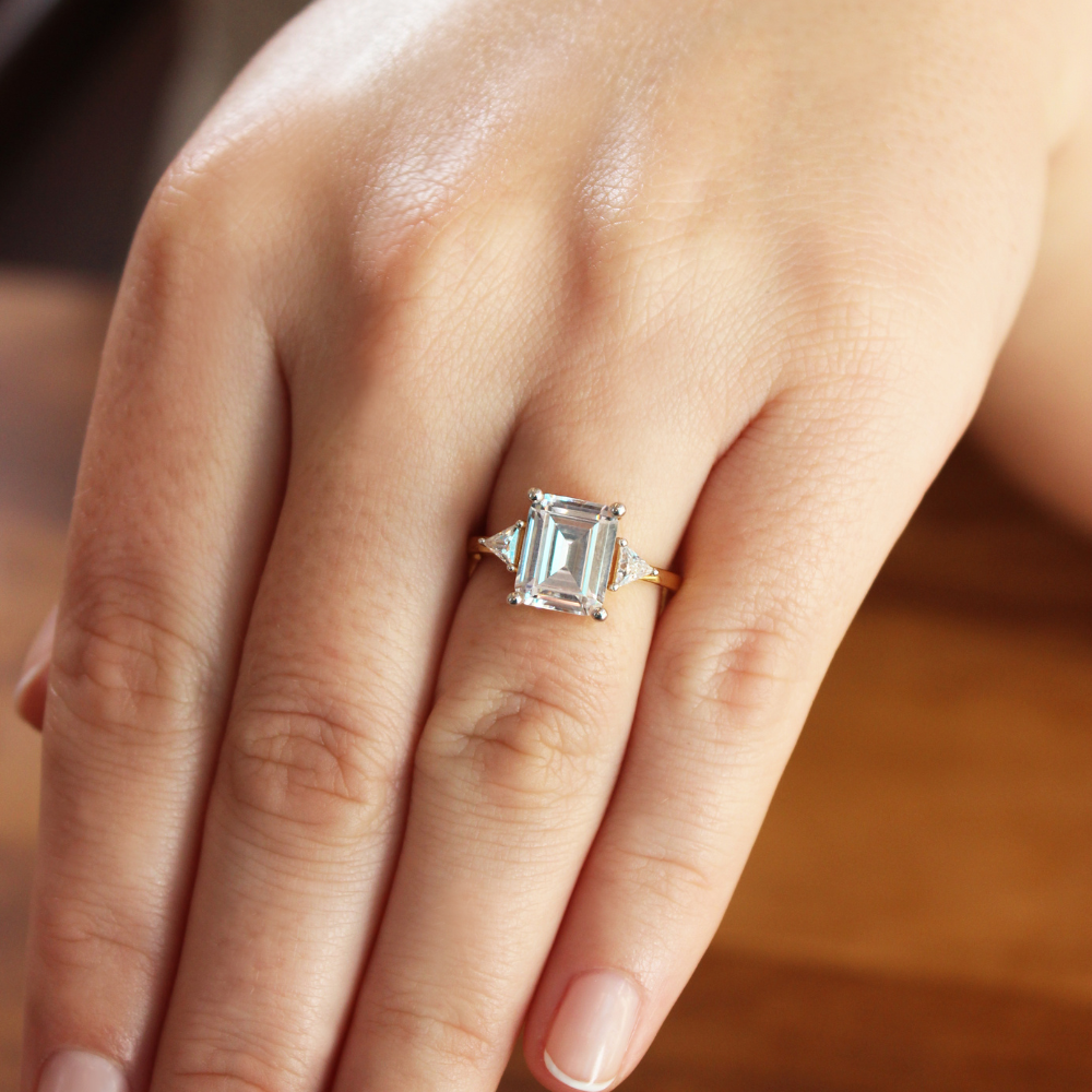 Prepare to be captivated with the Prism of Light Ring. This ring features a perfectly cut 3.80 ct. Emerald Cut Tru-Diamond as the centre gem, flanked by two Trillion Cut gems. This is a truly classic and elegant design that will ensure that you get compliments.