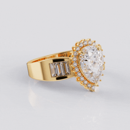 The Judy Garland Ring, an enchanting tribute to the timeless elegance and magnetic allure of the iconic actress, exudes a blend of classic sophistication and contemporary flair. At its heart lies a breathtaking 3.5 carat pear cut Tru-Diamond, reminiscent of the dazzling lights of Hollywood's golden era. Accompanied by a halo of delicate Tru-Diamonds™, inspired by Garland's iconic roles, each Tru-Diamonds™ gem sparkles with the same effervescence that captivated audiences worldwide during her magical portrayal of Dorothy Gale in "The Wizard of Oz". Finally, the ring is shouldered with three baguette cut Tru-Diamonds™ gems on each side, commemorating the six awards Judy Garland received during her life.