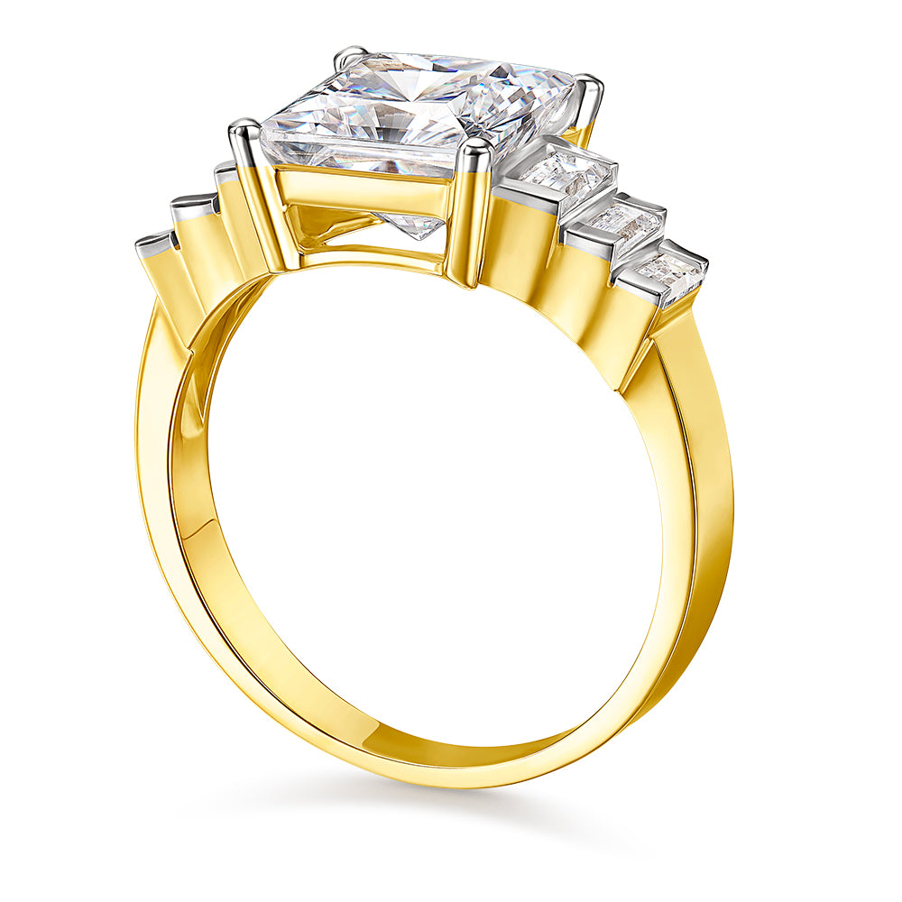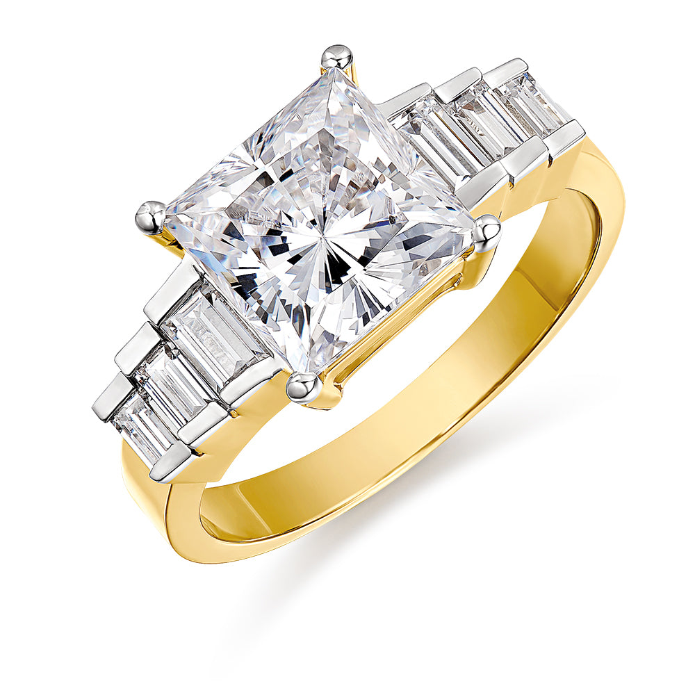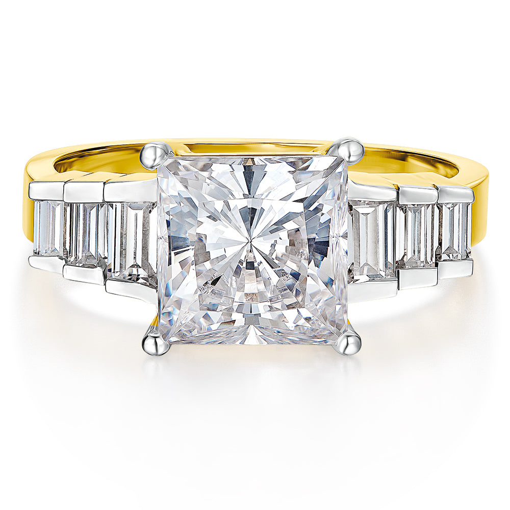 The Sunset Boulevard Ring brings art-deco glamour to the forefront with its geometric design and perfectly stepped baguette cut Tru-Diamonds™ side gems. A 4 ct. princess cut centre gem creates a pristine centre piece, lending this striking ring its timeless charm.