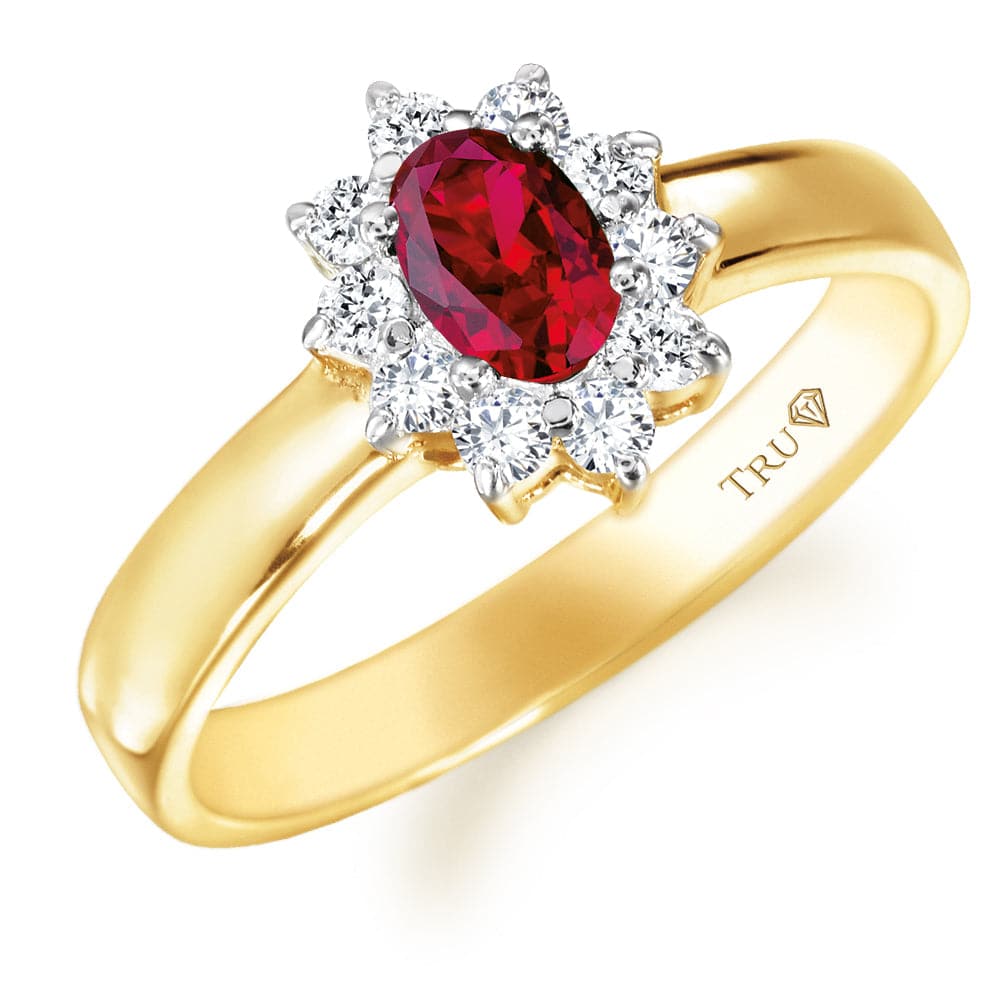 Tru Ruby Oval Cut Synthetic Lab Grown Diamond Halo Cluster Ring
