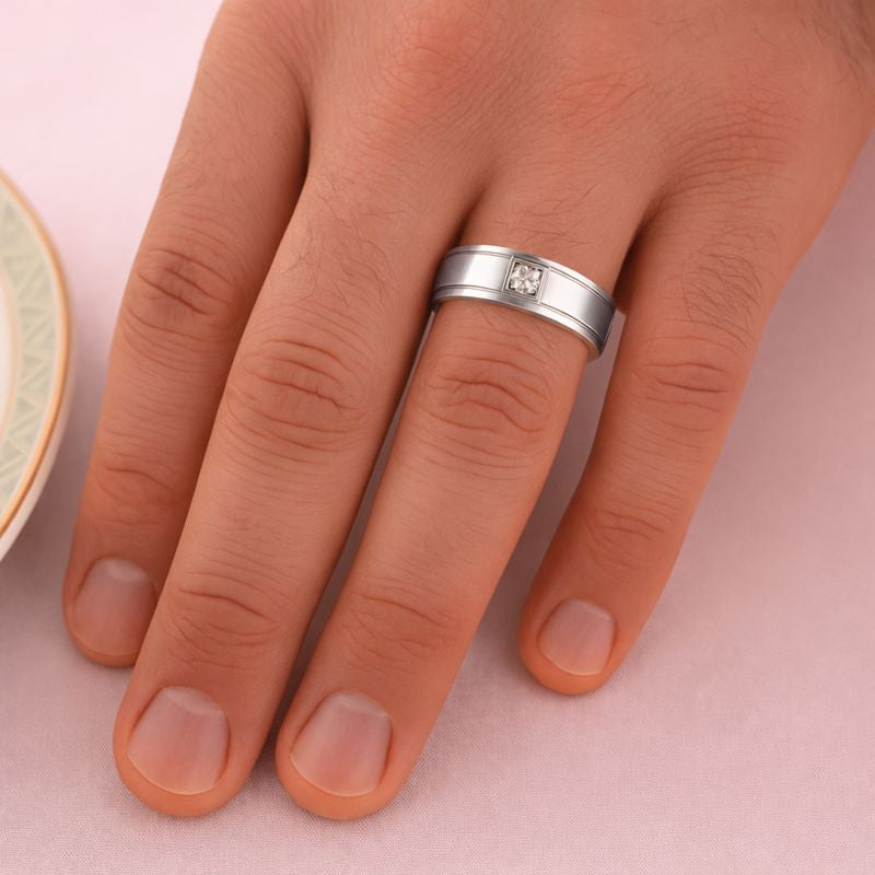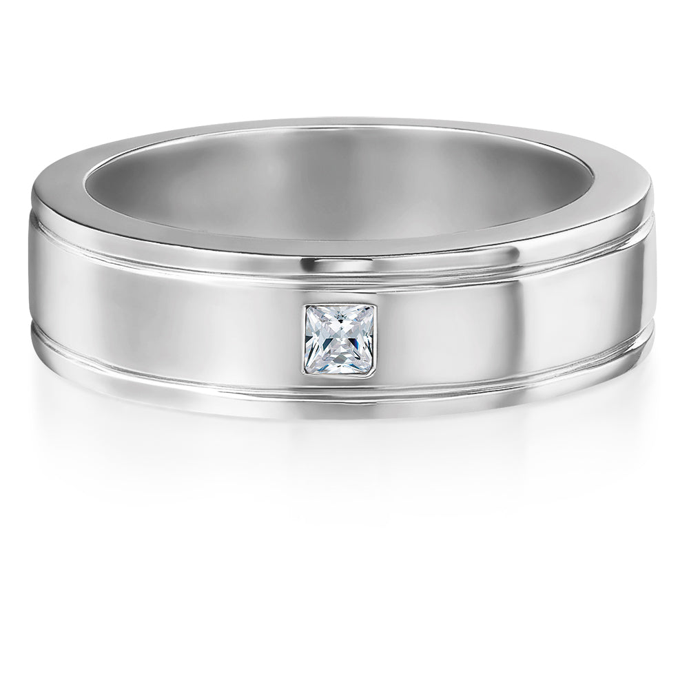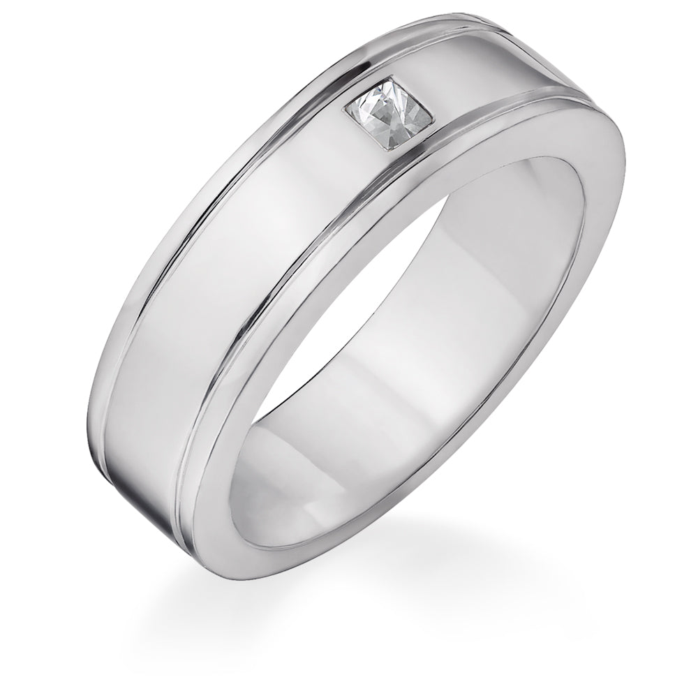 Classic with a modern twist, is best to describe this ring. The band is accented with clean lines and a single princess-cut gem, securely set at the center for understated brilliance. A ring that speaks of quiet confidence and enduring style.