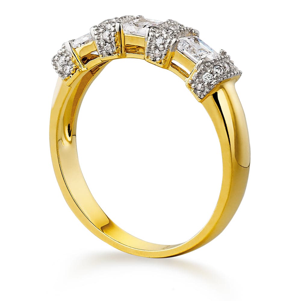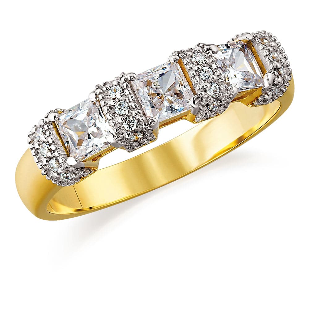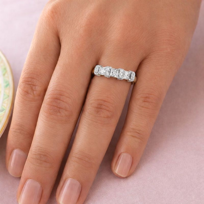 Cool, crisp, and irresistibly radiant, the Frozen Parfait Ring is a masterpiece of modern glamour. Featuring a row of princess-cut stones, each framed by clusters of sparkling gems, this design captures the brilliance of ice in the winter sun. Its bold yet refined style makes it perfect as a statement piece or a luxurious everyday treasure.