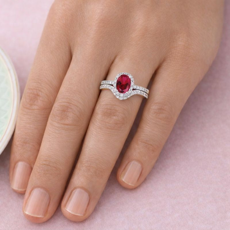 Tru Ruby Oval Cut Synthetic Lab Grown Diamond Halo Ring Set