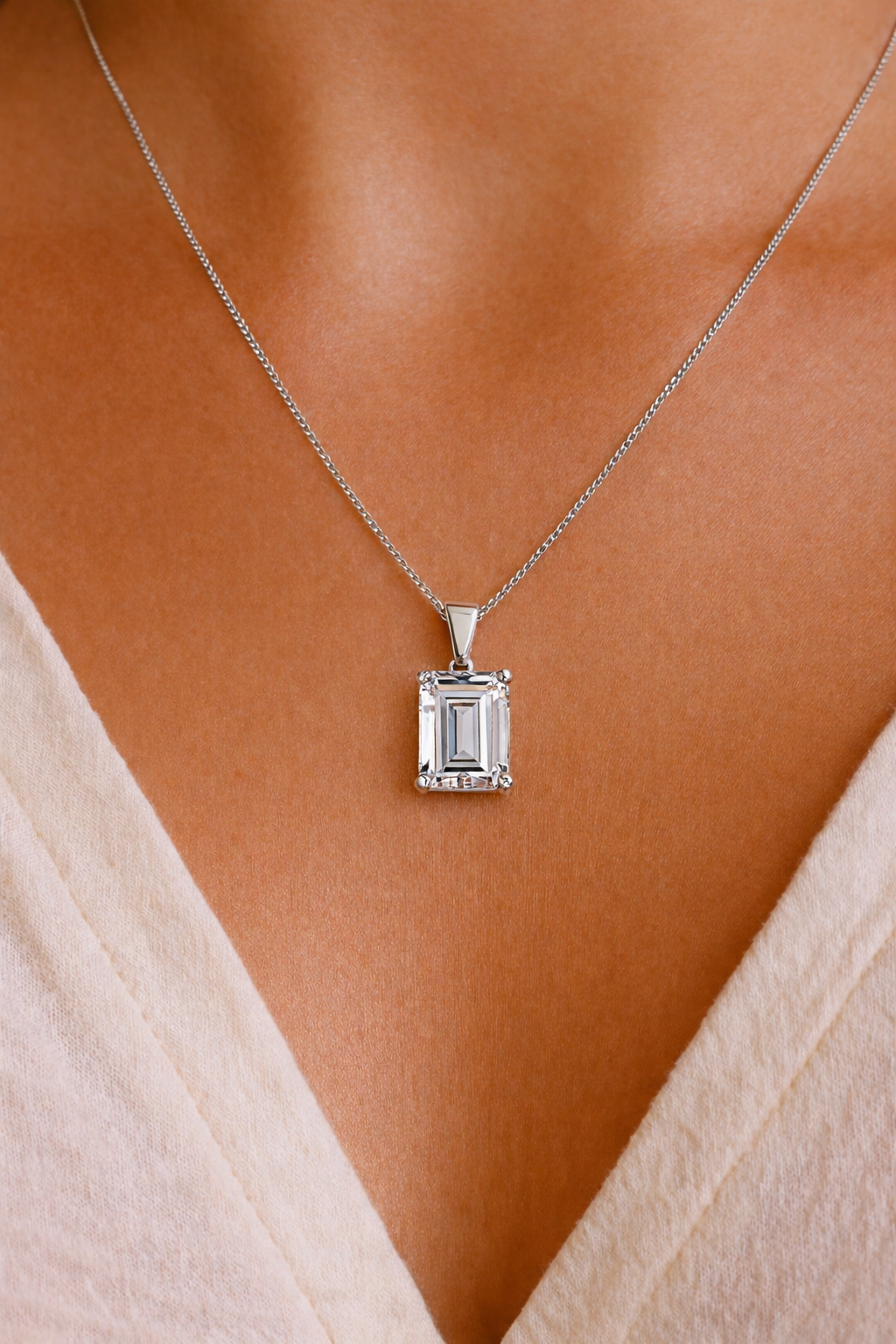 Our 2.50 ct. Emerald Cut Pendant is a simple yet classy piece, making it the perfect accessory for any outfit.