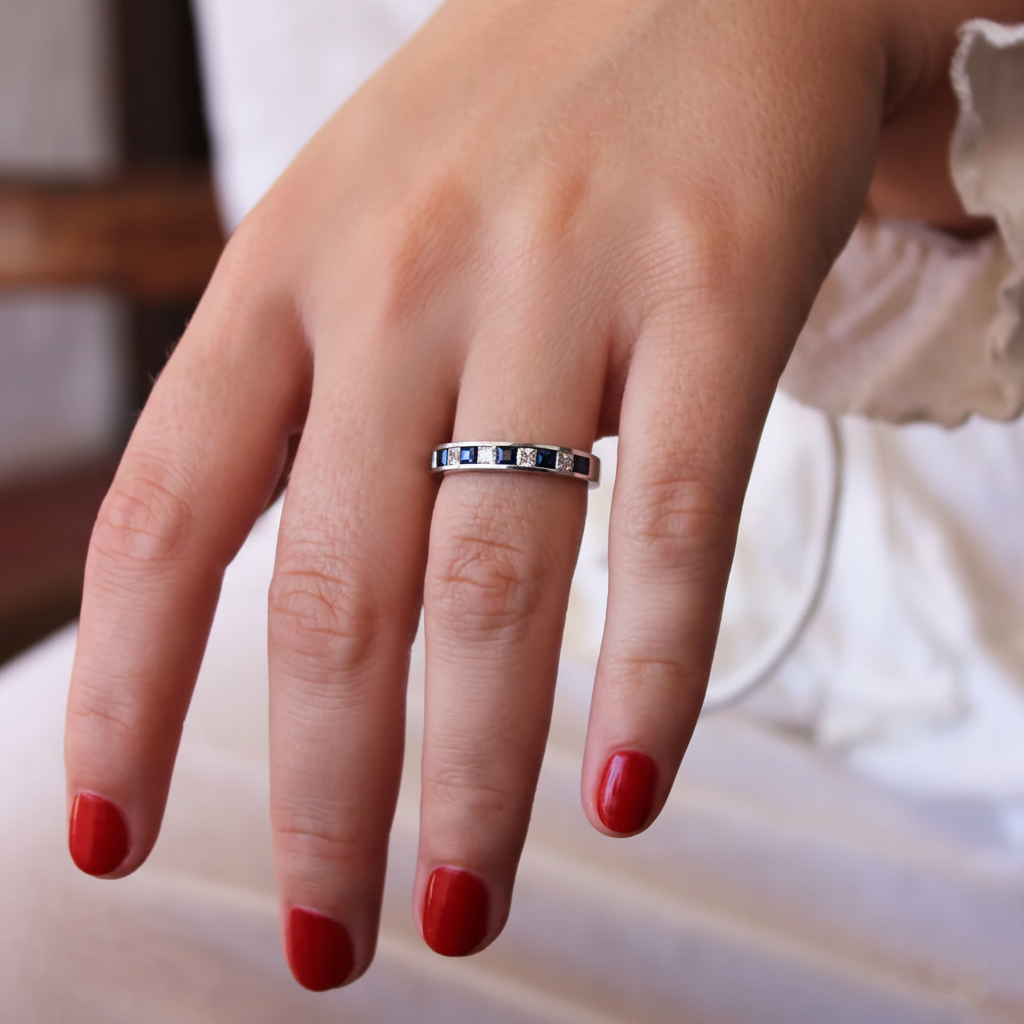 For a dash of sophisticated colour you’ll absolutely adore our Rhapsody in Blue eternity ring. It’s beautifully set with alternating Tru-Diamonds™ and Tru Sapphires totalling 1.10 carats. Whether worn on its own or combined with other rings from your collection, you’ll love the pop of colour this elegant eternity brings to any outfit.