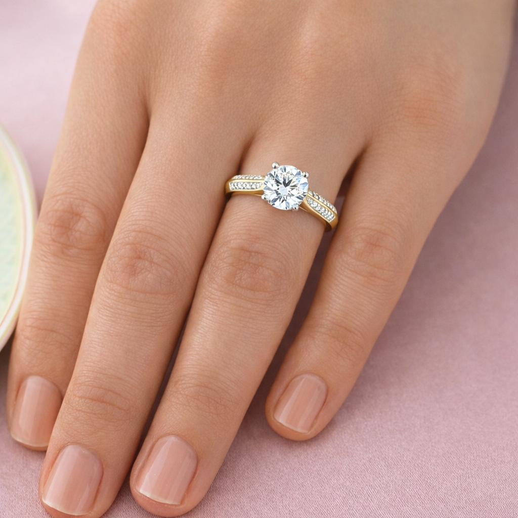 Adorn your finger with the captivating allure of the Accolade ring, showcasing a stunning 2 ct. ice white Tru Diamond, radiating brilliance and elegance. Be prepared to captivate attention and receive compliments wherever you go with this remarkable piece adorning your hand. Perfect for elevating your everyday ensemble with timeless sophistication.