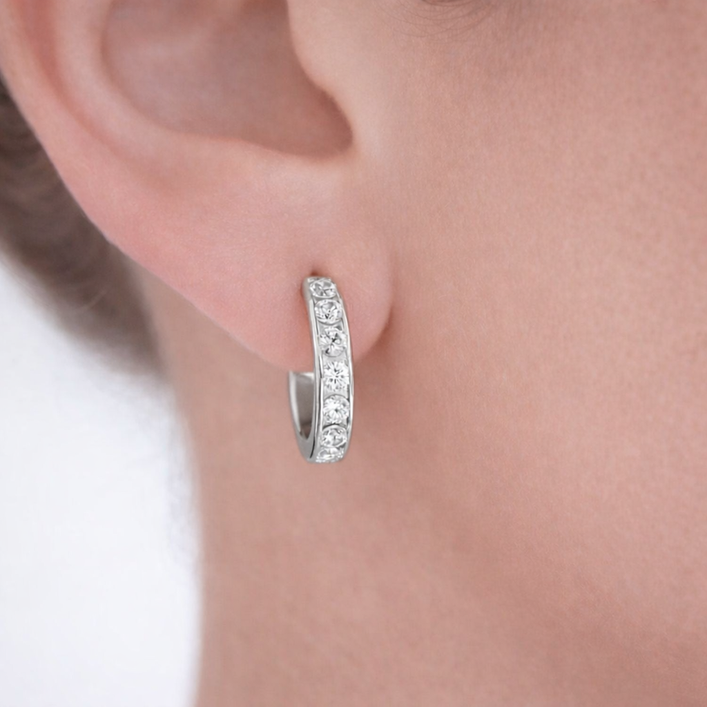 Simple and beautiful, the Coco Hoop Earrings are inspired by the house of Chanel’s famous on-the-ear hoop earring styles. These channel set with genuine Tru-Diamonds™ and measuring 18mm in diameter, are comfortable enough to wear all day, and impressive enough for an evening out on the town.
