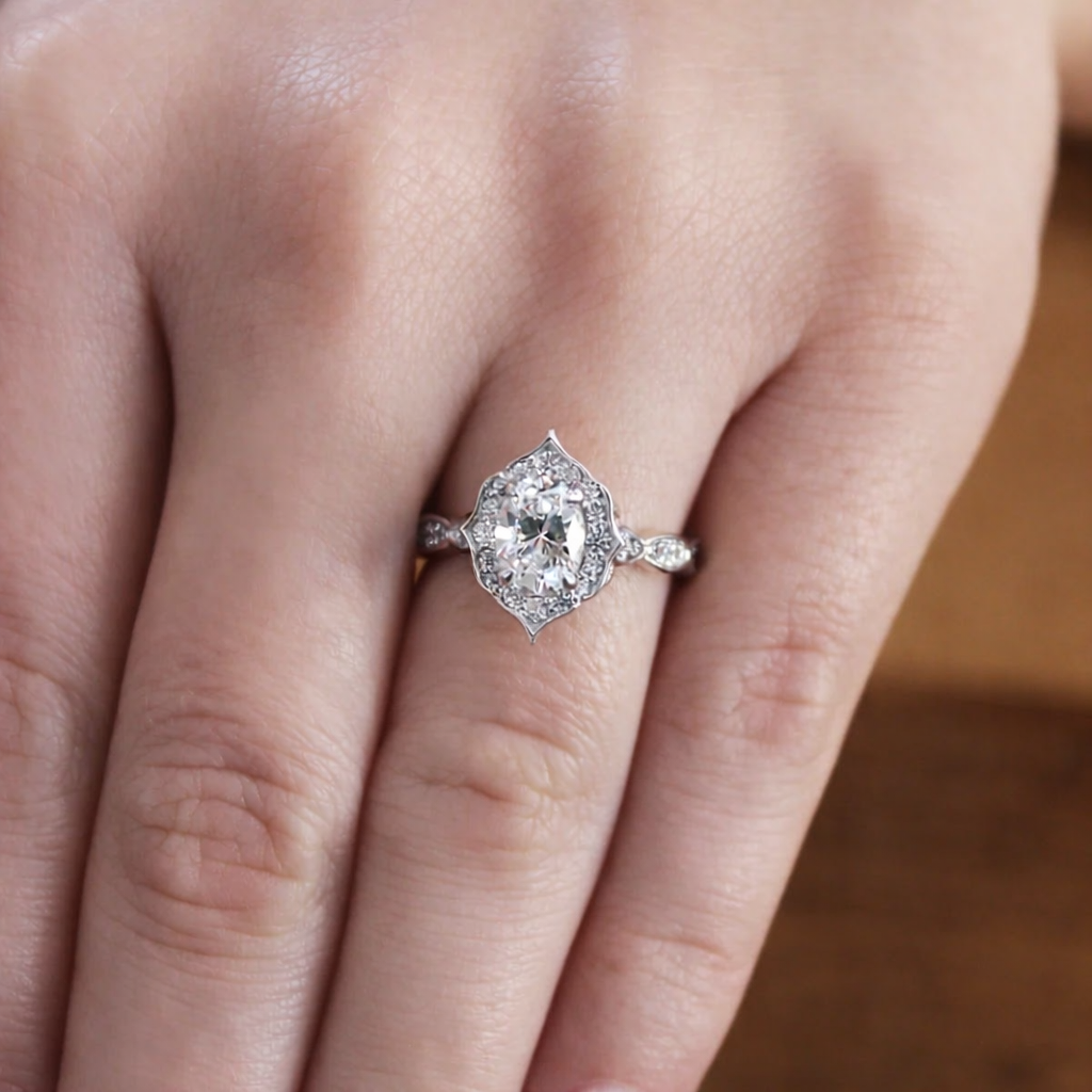 Tru-Diamonds™ Oval Cut Synthetic Lab Grown Diamond Halo Vintage Cathedral Set Ring
