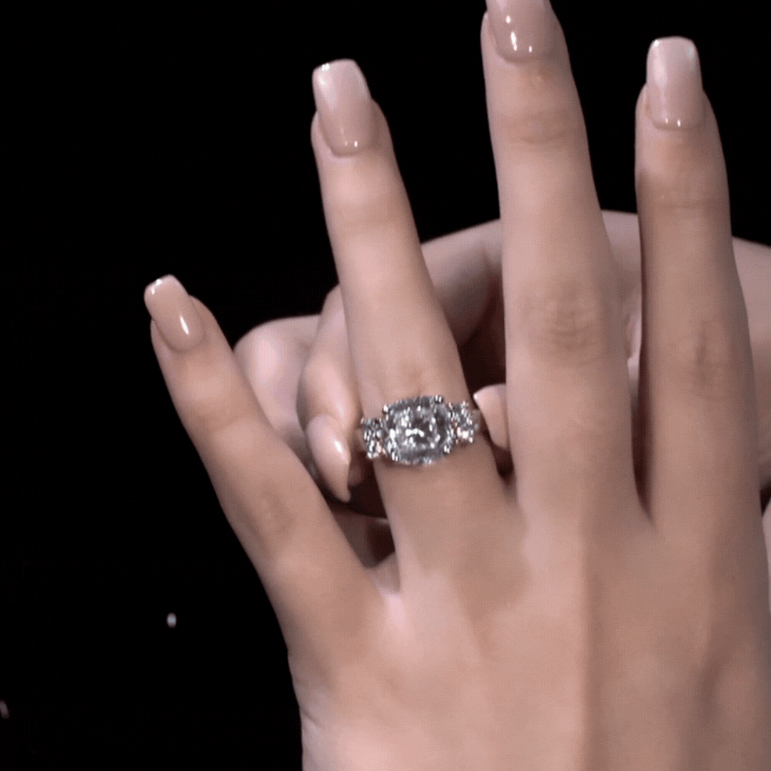 Create a sensation every time you wear this Pure Perfection Ring with its breathtaking 5.62 carat cushion-cut Tru-Diamonds™ centre gem and three 0.10 carat round brilliant Tru-Diamonds™ on either side.