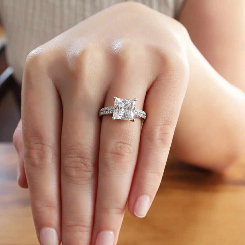 Fit for royalty, the Grand Accolade Princess Ring features a commanding 4.25 ct. t.w. of flawless Tru-Diamonds™, highlighted by a bold princes centre gem. This luxurious piece delivers maximum brilliance and timeless style. Ideal for those who adore classic glamour with a modern edge.